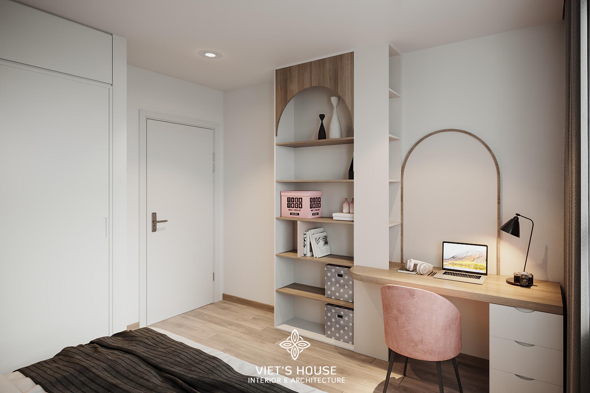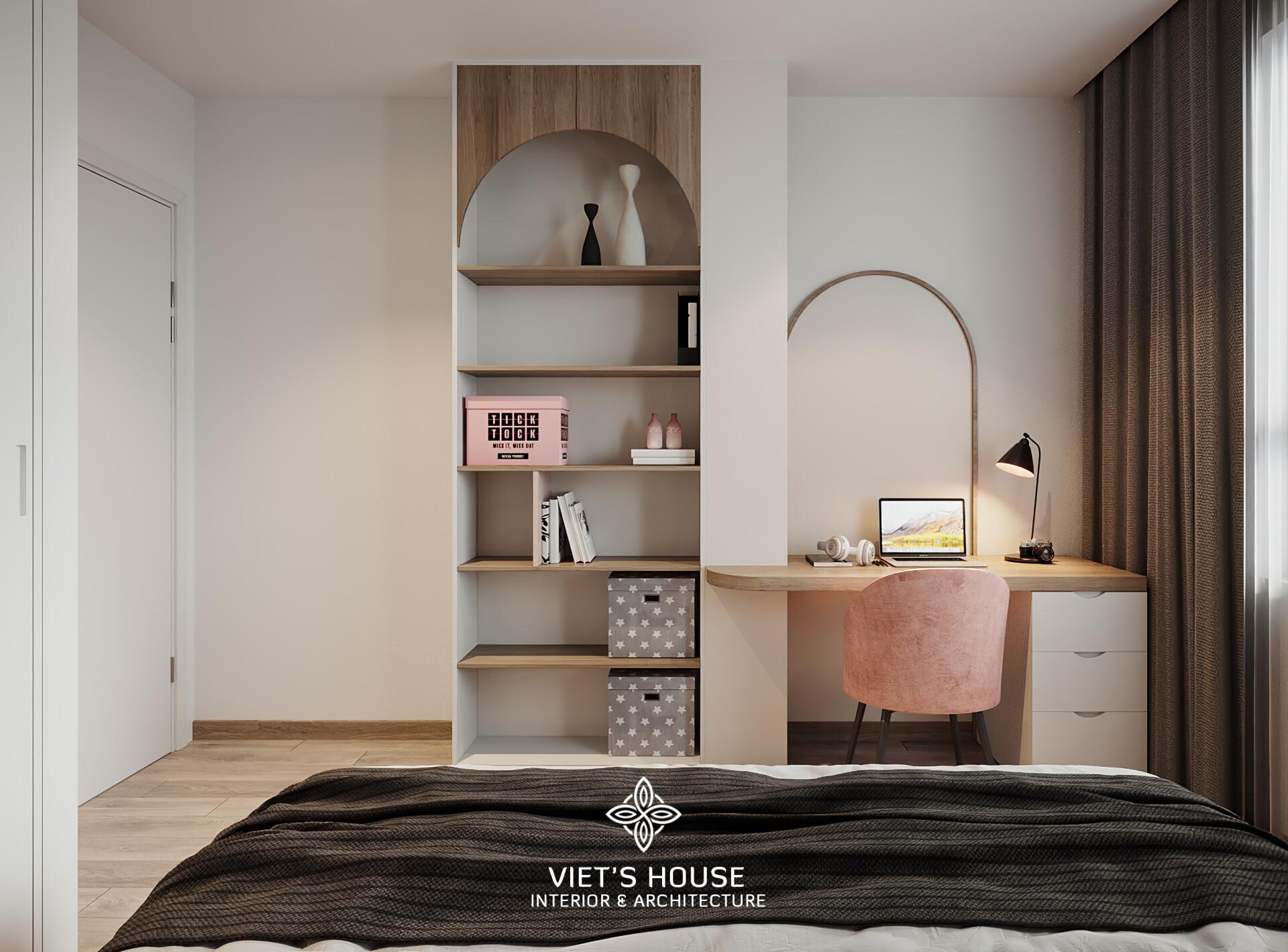 Góc khác của phòng phụ, kệ mở kết hợp bàn học với chi tiết vòm cong mềm mại, cá tính.