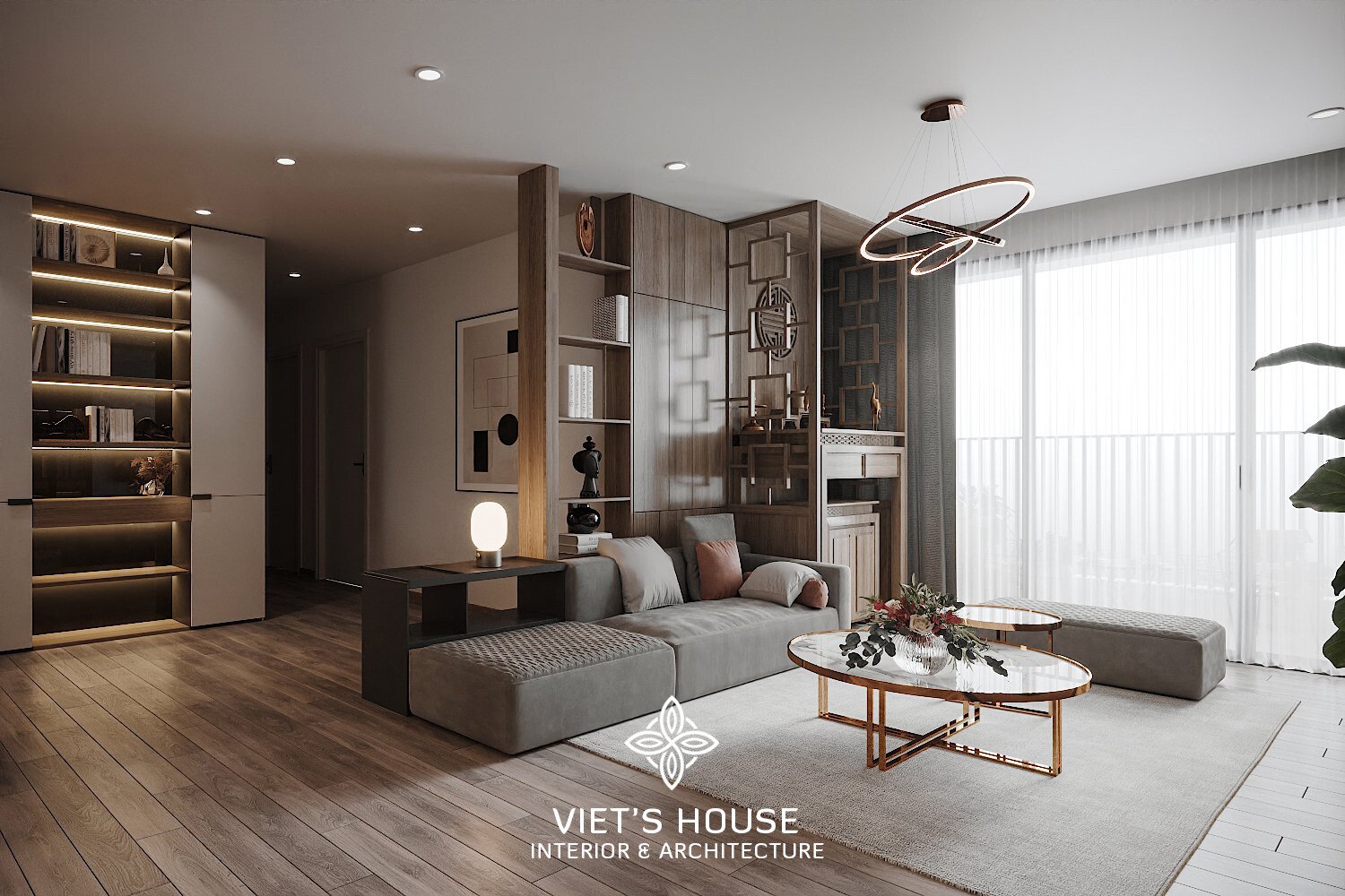 Tầm nhìn mở ra phòng khách, nổi bật với kệ trang trí kết hợp ánh sáng hắt đầy tinh tế.