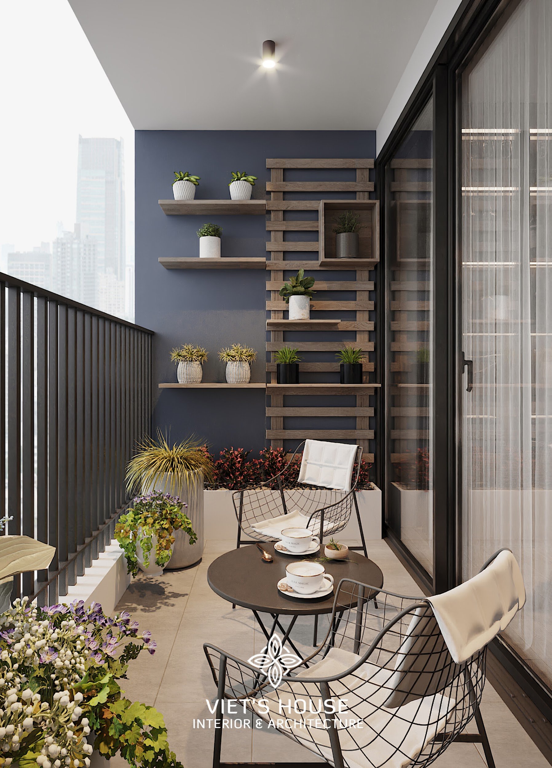 Ban công xanh mát với kệ gỗ và nhiều chậu cây, bộ bàn ghế nhỏ gọn tạo góc thư giãn lý tưởng.