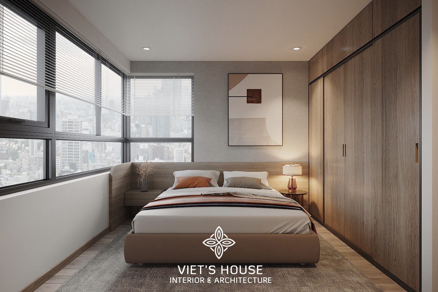 Góc trực diện giường master, cửa sổ lớn đón sáng, tranh tối giản đầu giường tạo điểm nhấn