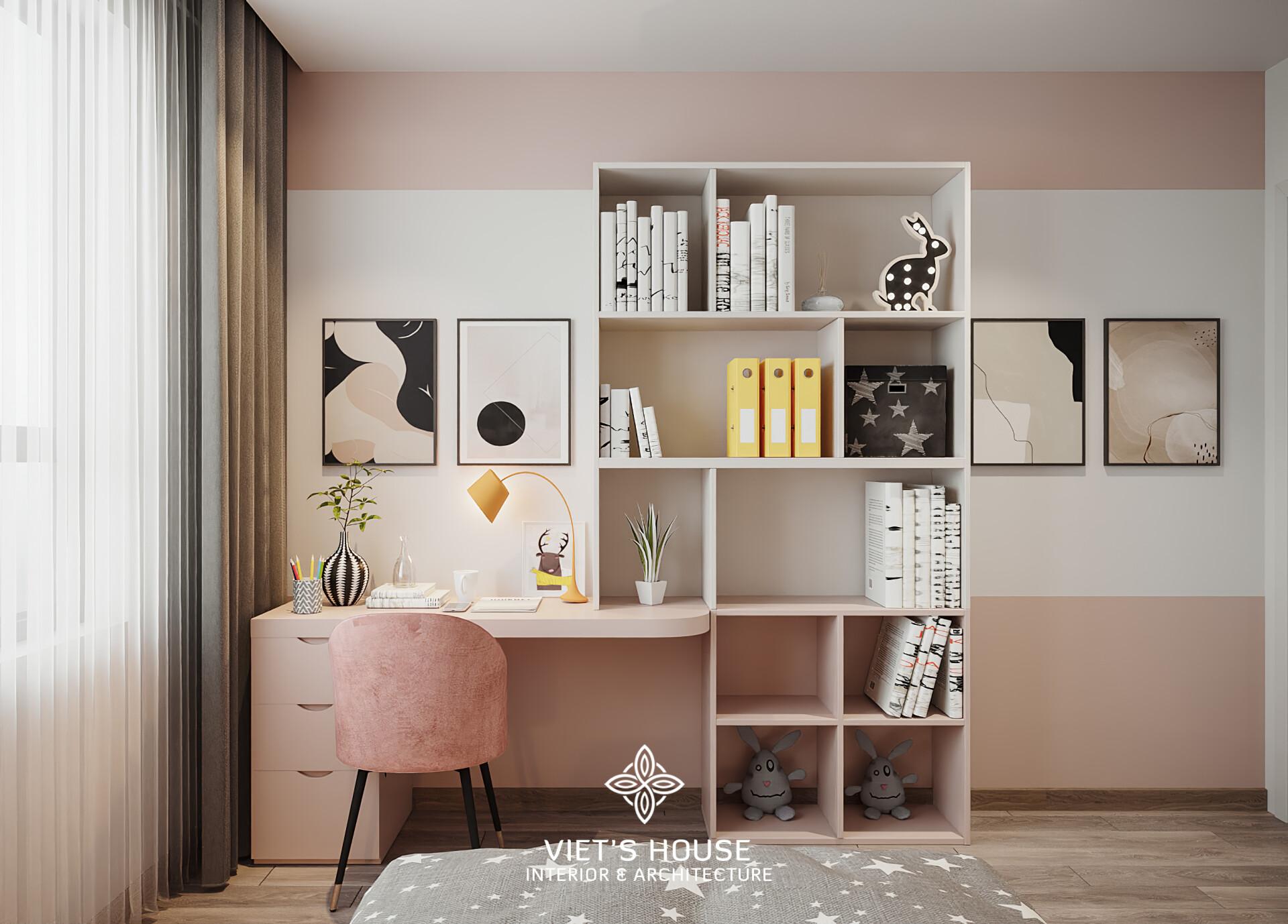 Góc học tập trong phòng ngủ phụ, bàn gỗ – ghế hồng nổi bật, kệ sách trang trí tiện dụng.
