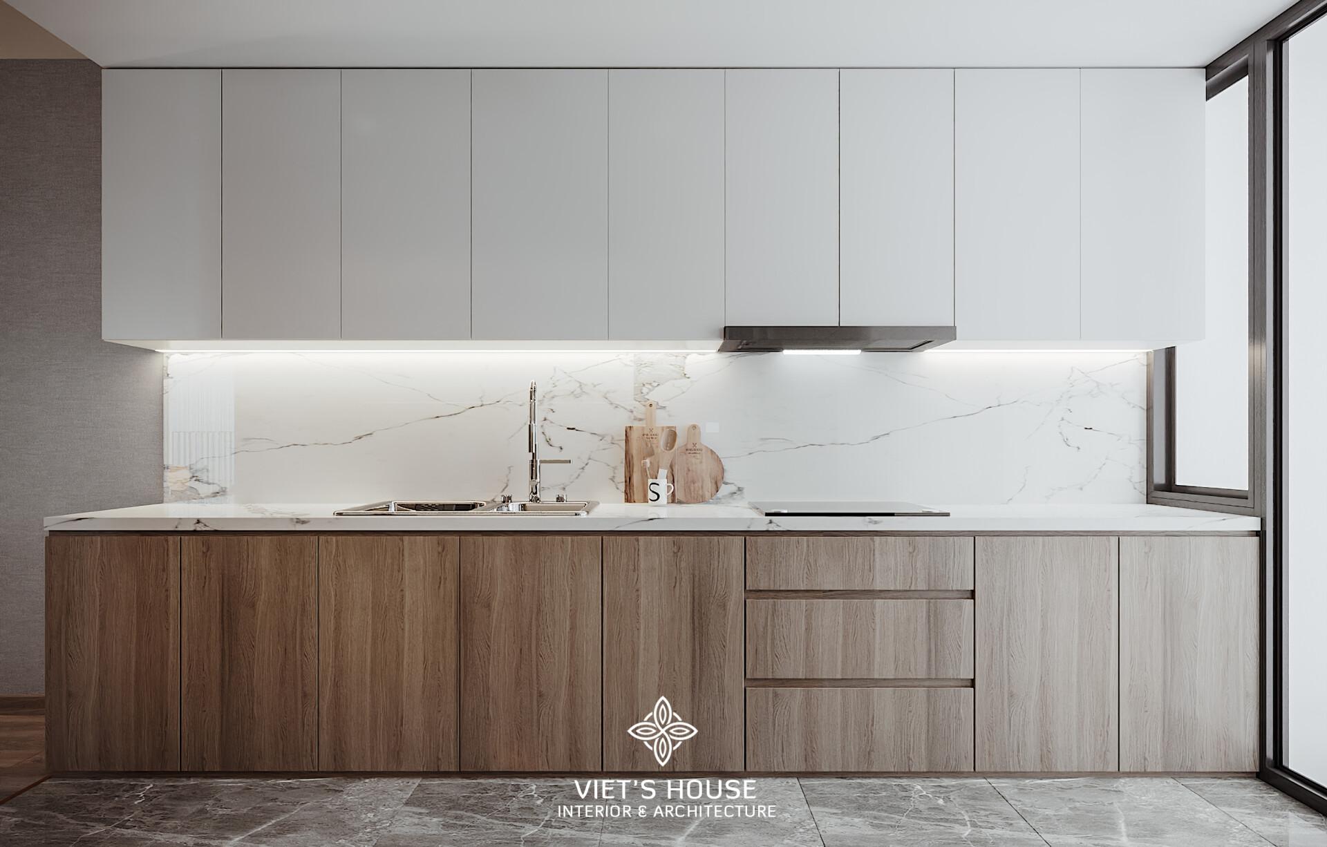 Hệ tủ bếp chữ I với đá marble trắng vân mây, kết hợp tủ gỗ dưới và tủ trắng trên, sạch sẽ và sang trọng.
