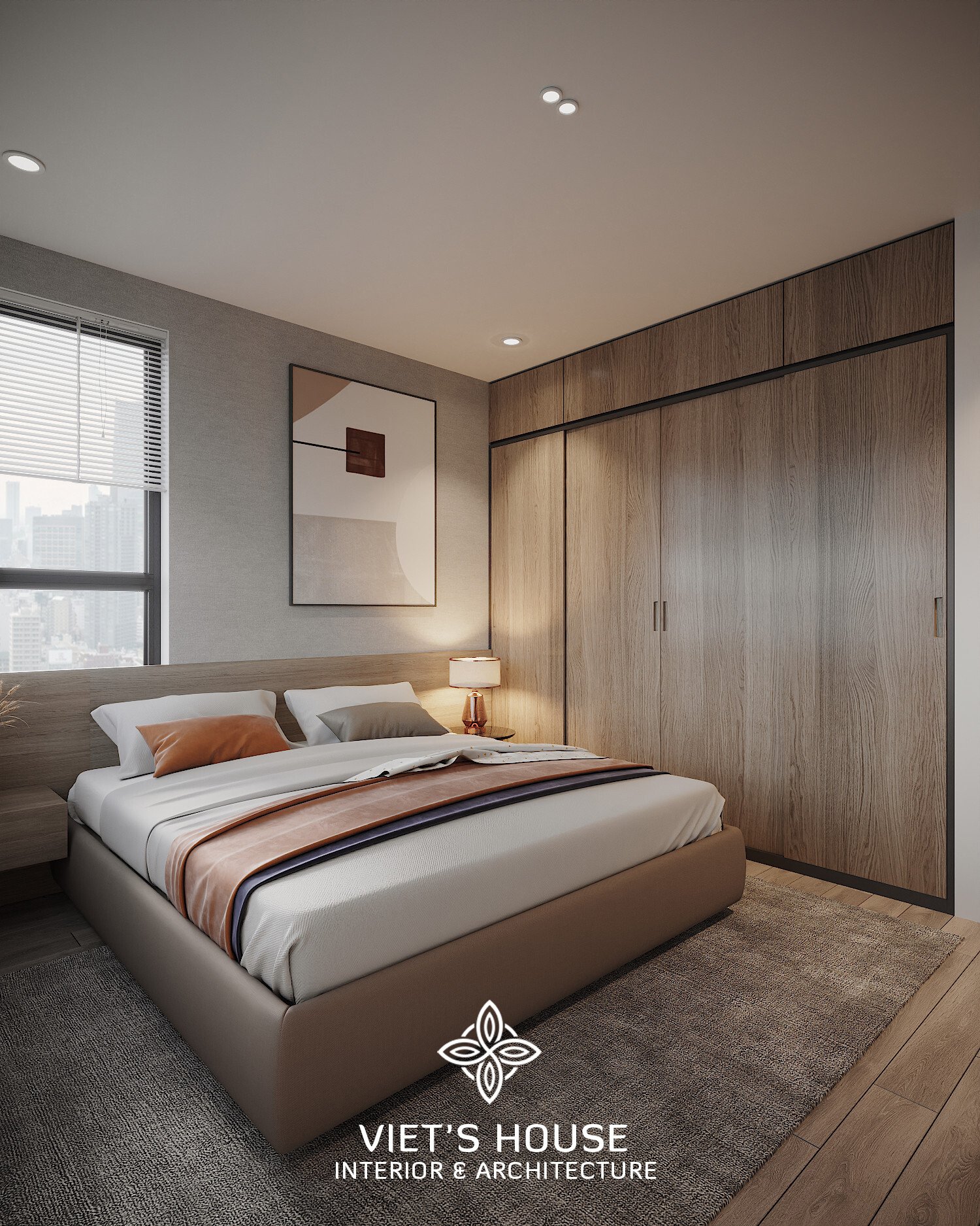 Phòng ngủ master với giường bọc nệm be, ga trắng, chăn nâu – cam, cùng tủ gỗ âm tường rộng.