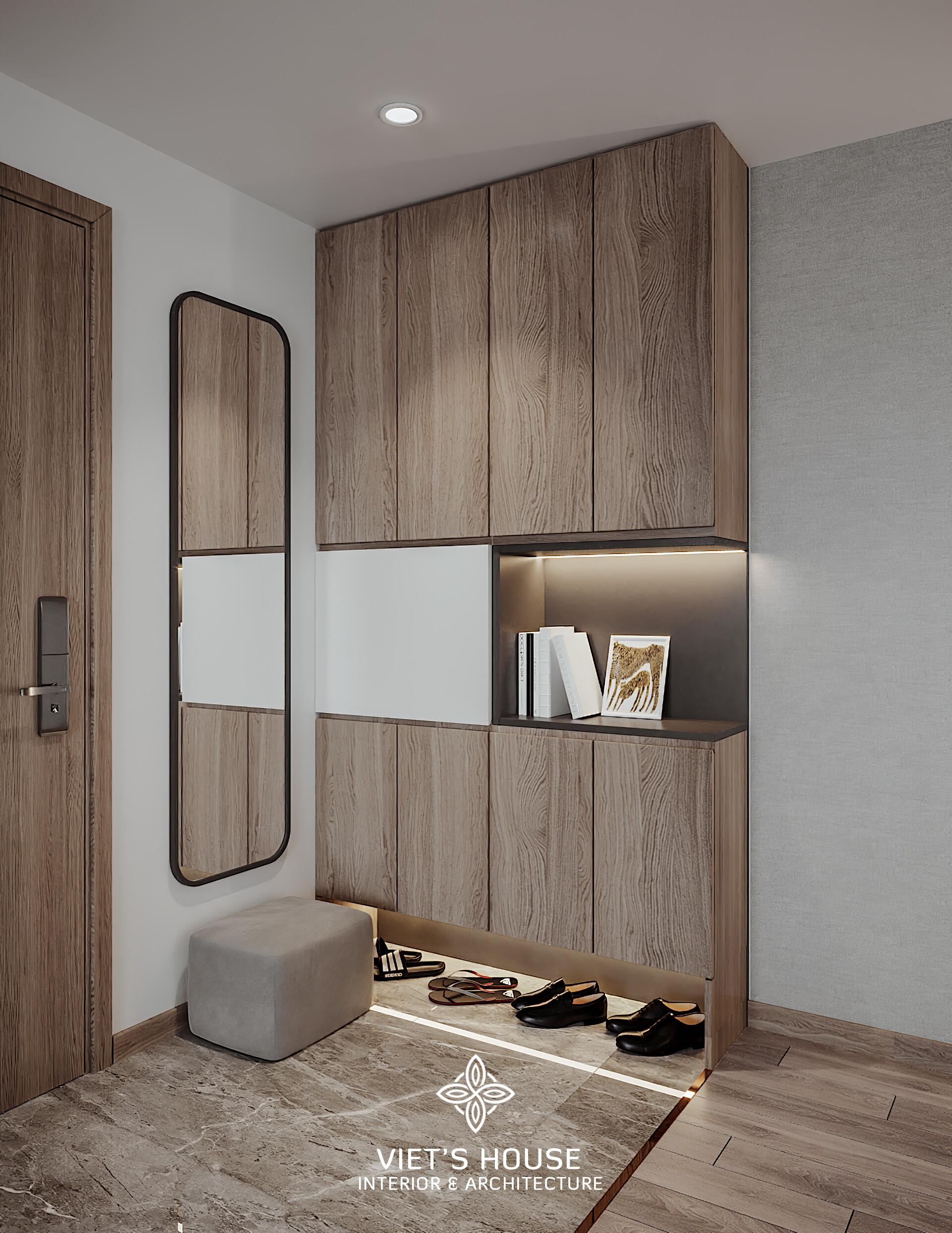 Tủ âm tường với đường nét tối giản, kết hợp hộc trưng bày nhỏ cùng ánh sáng hắt, mang đến sự gọn gàng tinh tế.