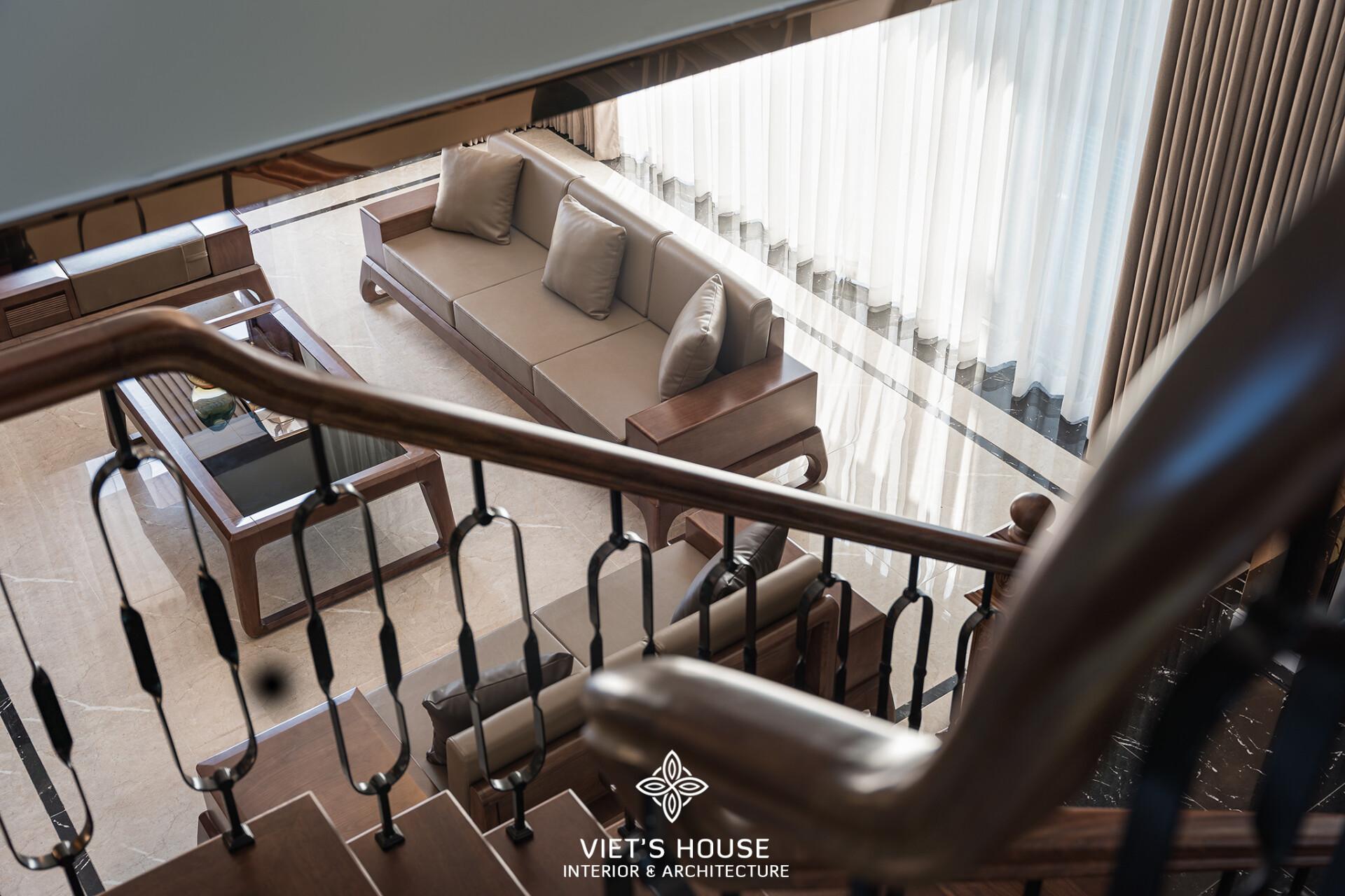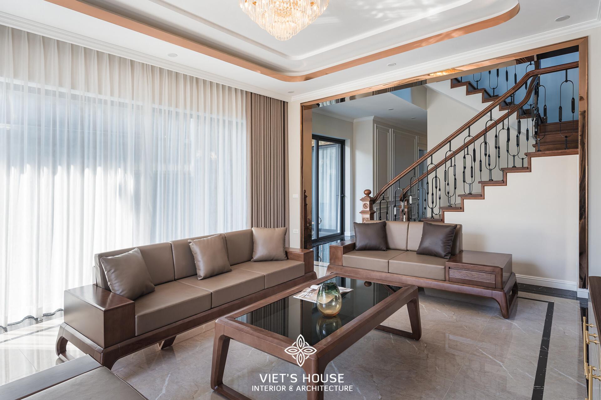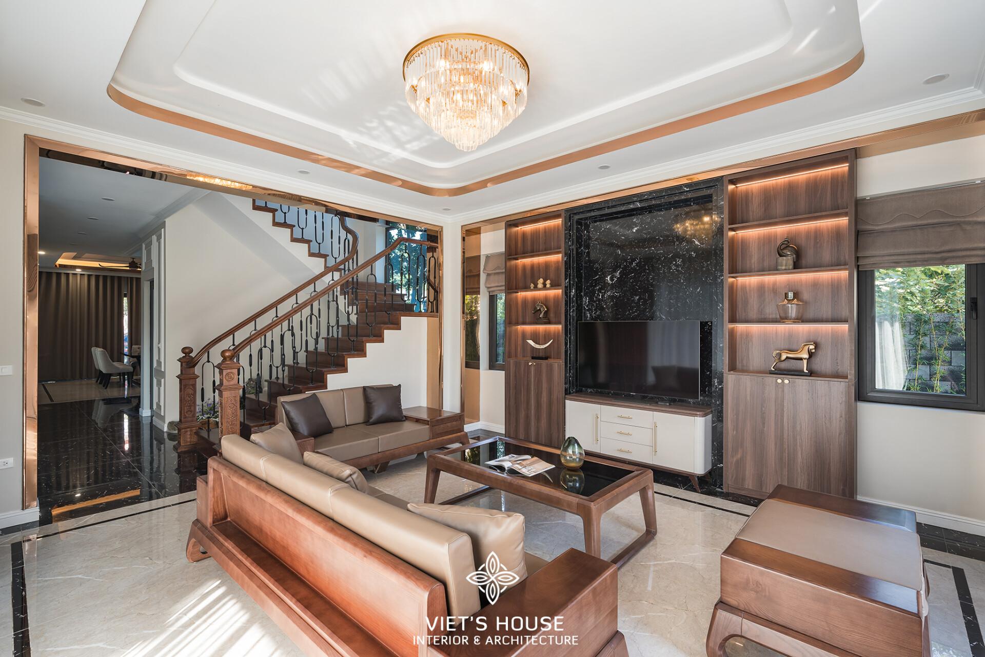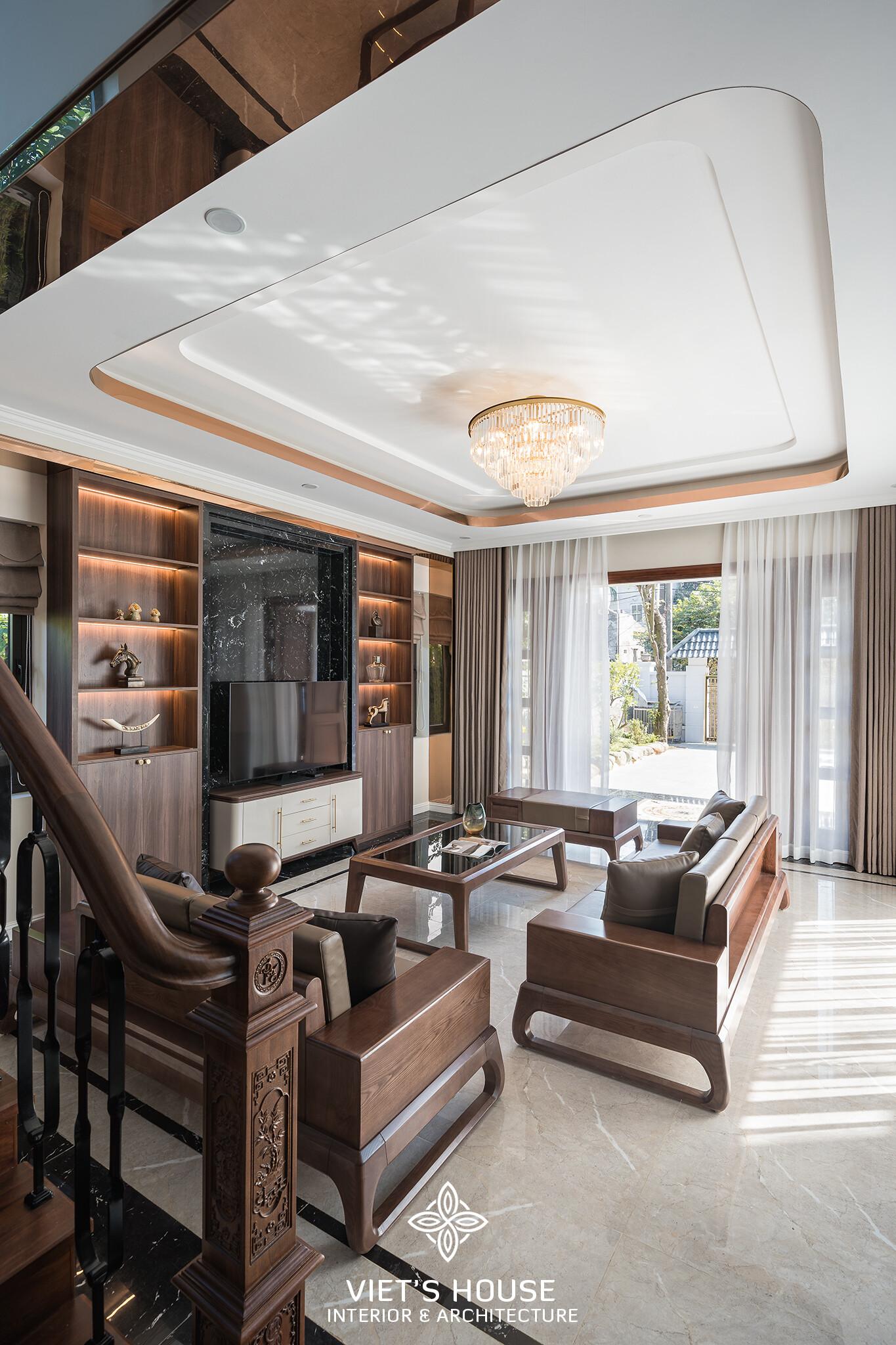 Phòng khách - sự bề thế và sang trọng: Phòng khách rộng mở với cửa kính lớn tràn ánh sáng. Nội thất gỗ kết hợp sofa da cao cấp, điểm nhấn là mảng tường đá đen vân mạnh mẽ. Đèn chùm pha lê tinh tế và cầu thang gỗ tay vịn kim loại uốn cong càng làm nổi bật vẻ bề thế, sang trọng nhưng vẫn ấm áp.