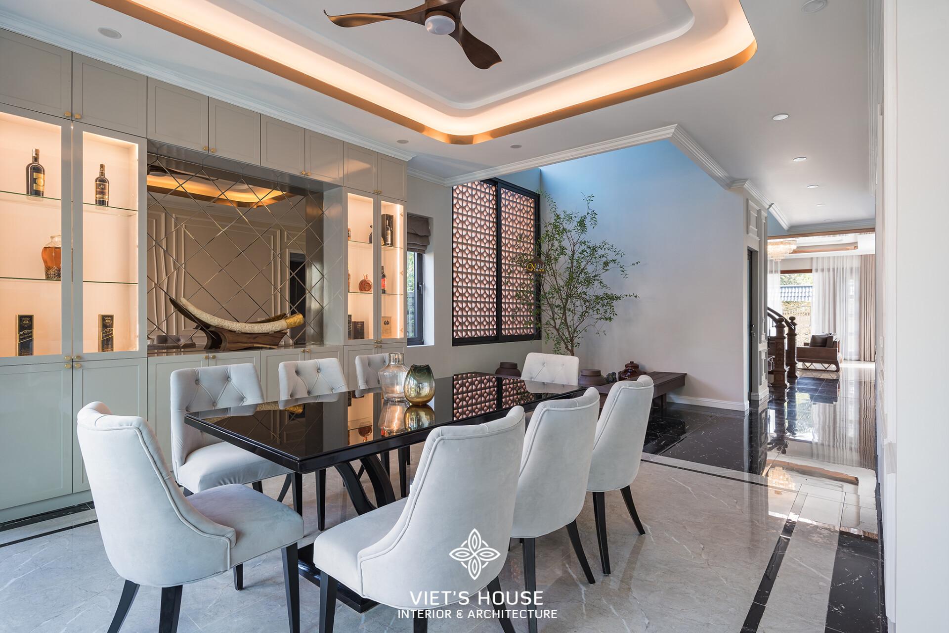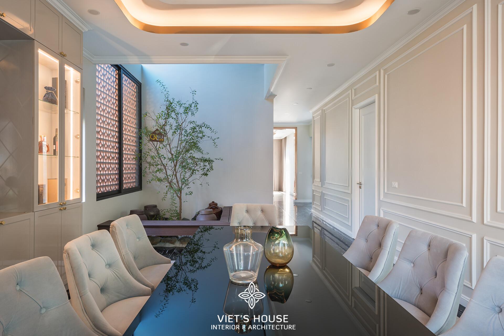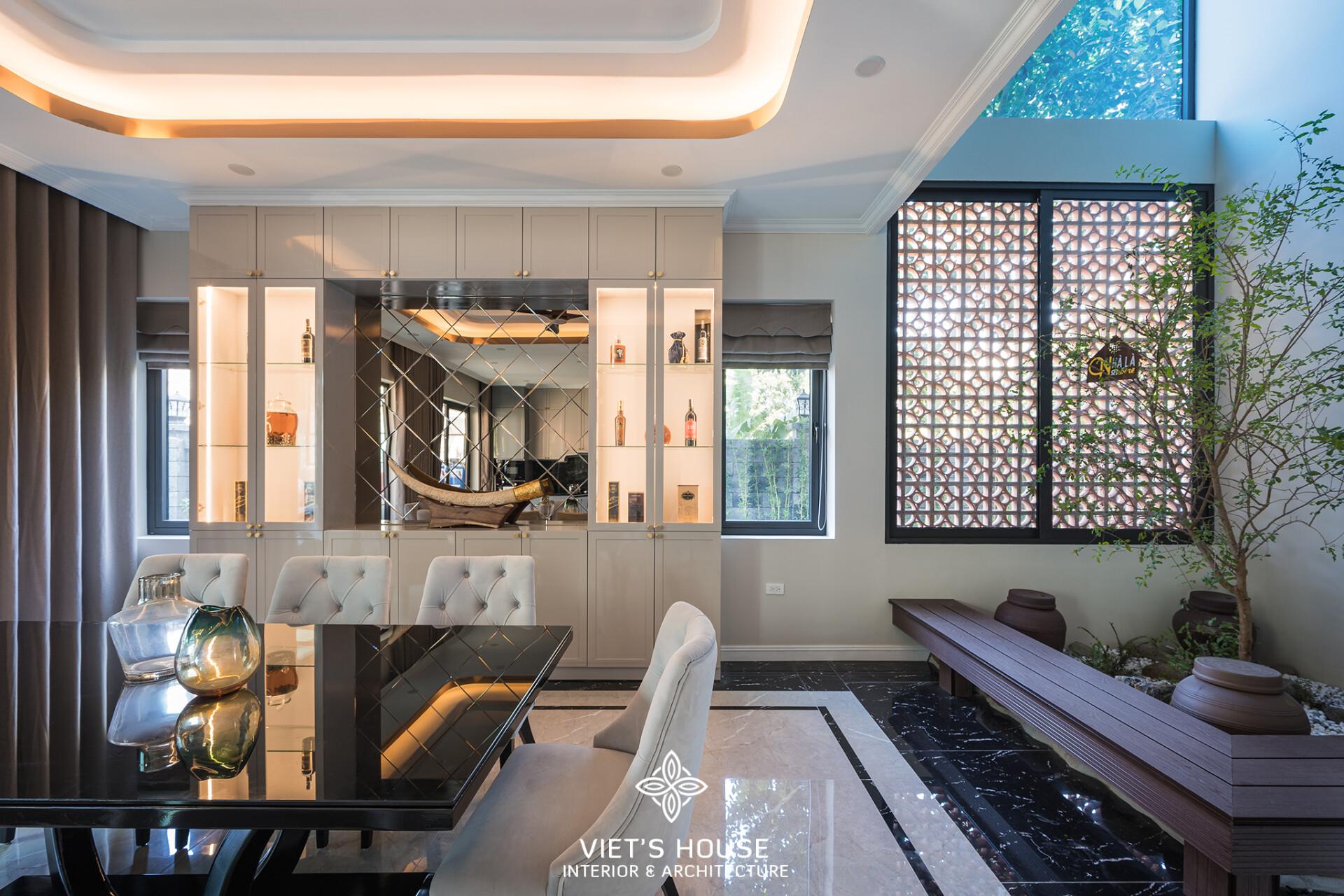 Bếp & ăn - nơi gắn kết gia đình: Khu bàn ăn được đặt cạnh giếng trời, hòa quyện cùng ánh sáng tự nhiên và tiểu cảnh xanh. Bàn ăn tinh tế, phông nền là tủ rượu và gương phản chiếu, tạo nên chiều sâu sang trọng. Bếp chữ L với mặt đá đen vân mây, hệ tủ sáng màu và thiết bị hiện đại mang lại sự tiện nghi tối đa, giúp mỗi bữa cơm trở thành trải nghiệm sum vầy đáng nhớ.