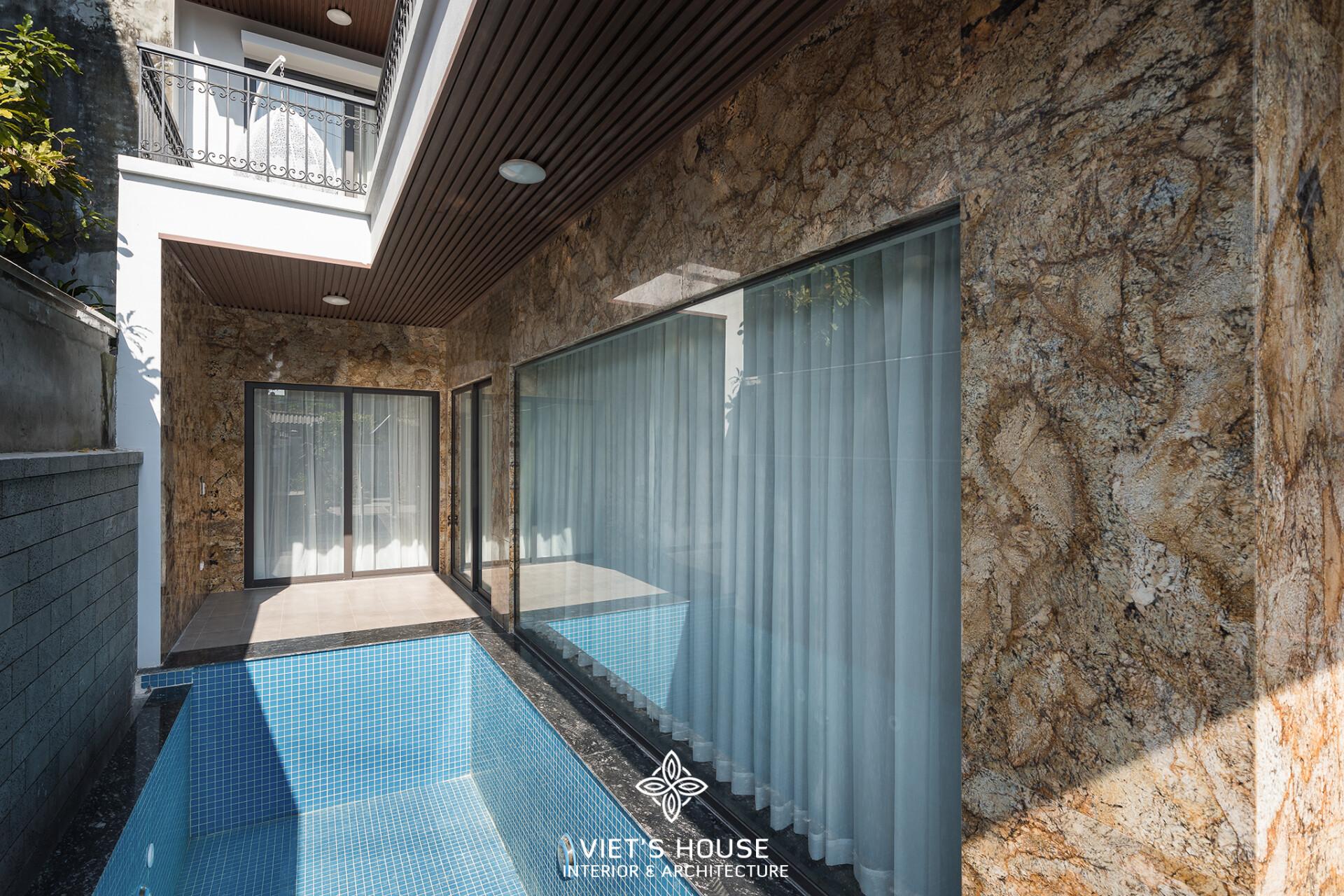 Hồ bơi cạnh nhà, ốp gạch xanh mát, viền tường đá tự nhiên mang vẻ sang trọng.