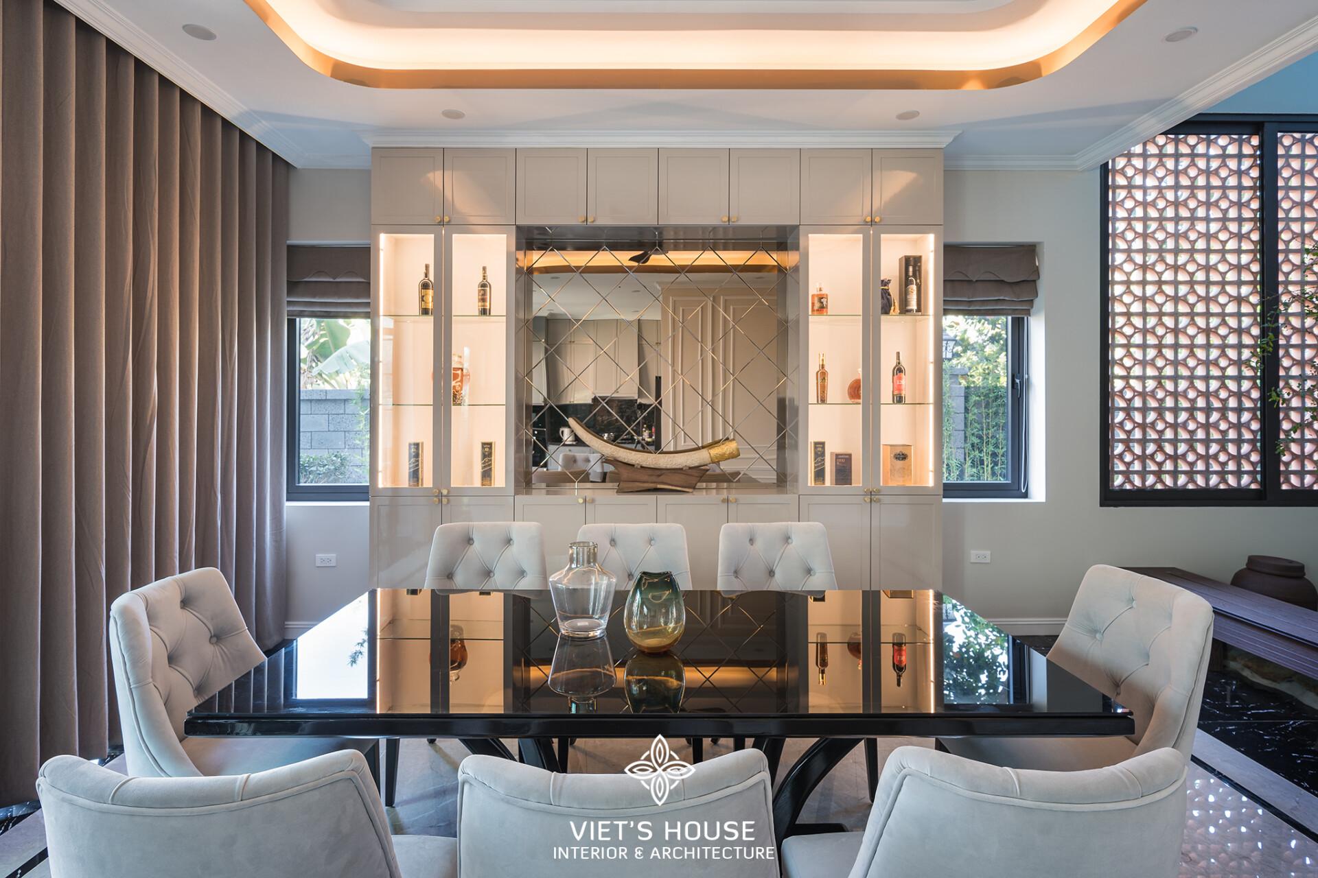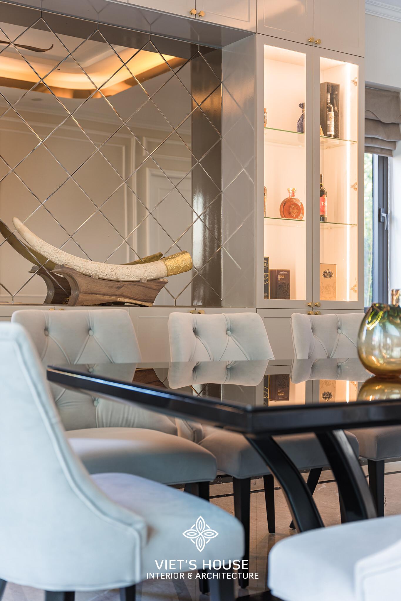 Góc nhìn bàn ăn với tủ trưng bày rượu và gương ốp sau tạo chiều sâu.