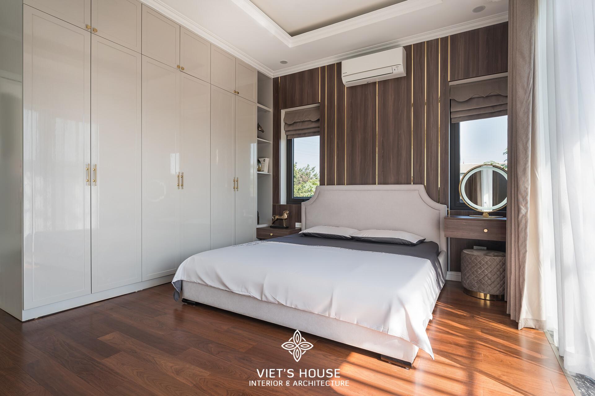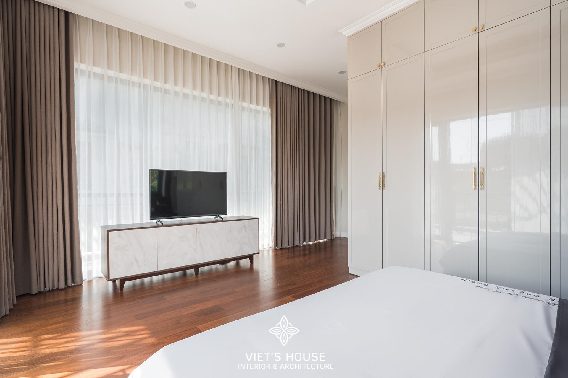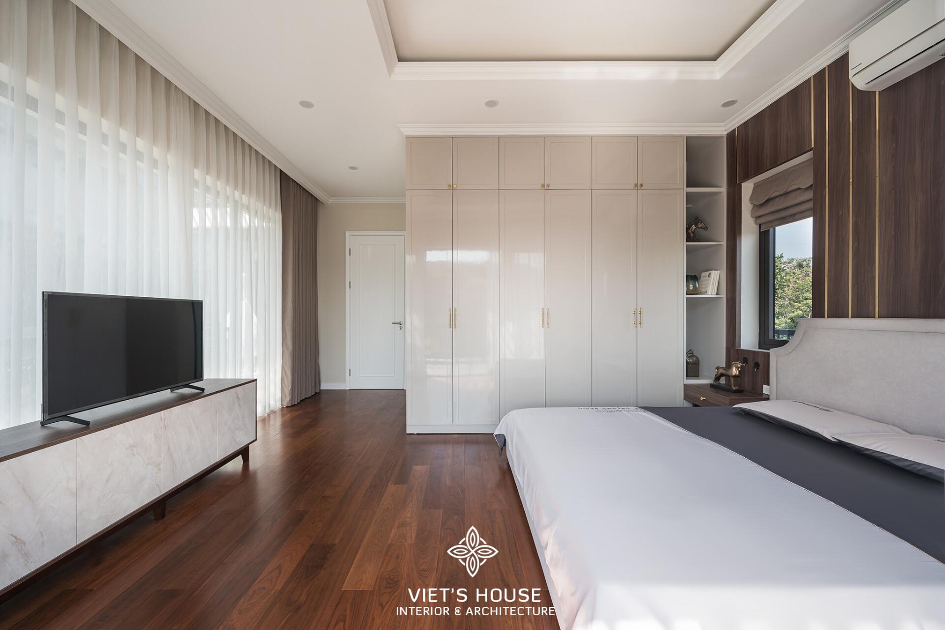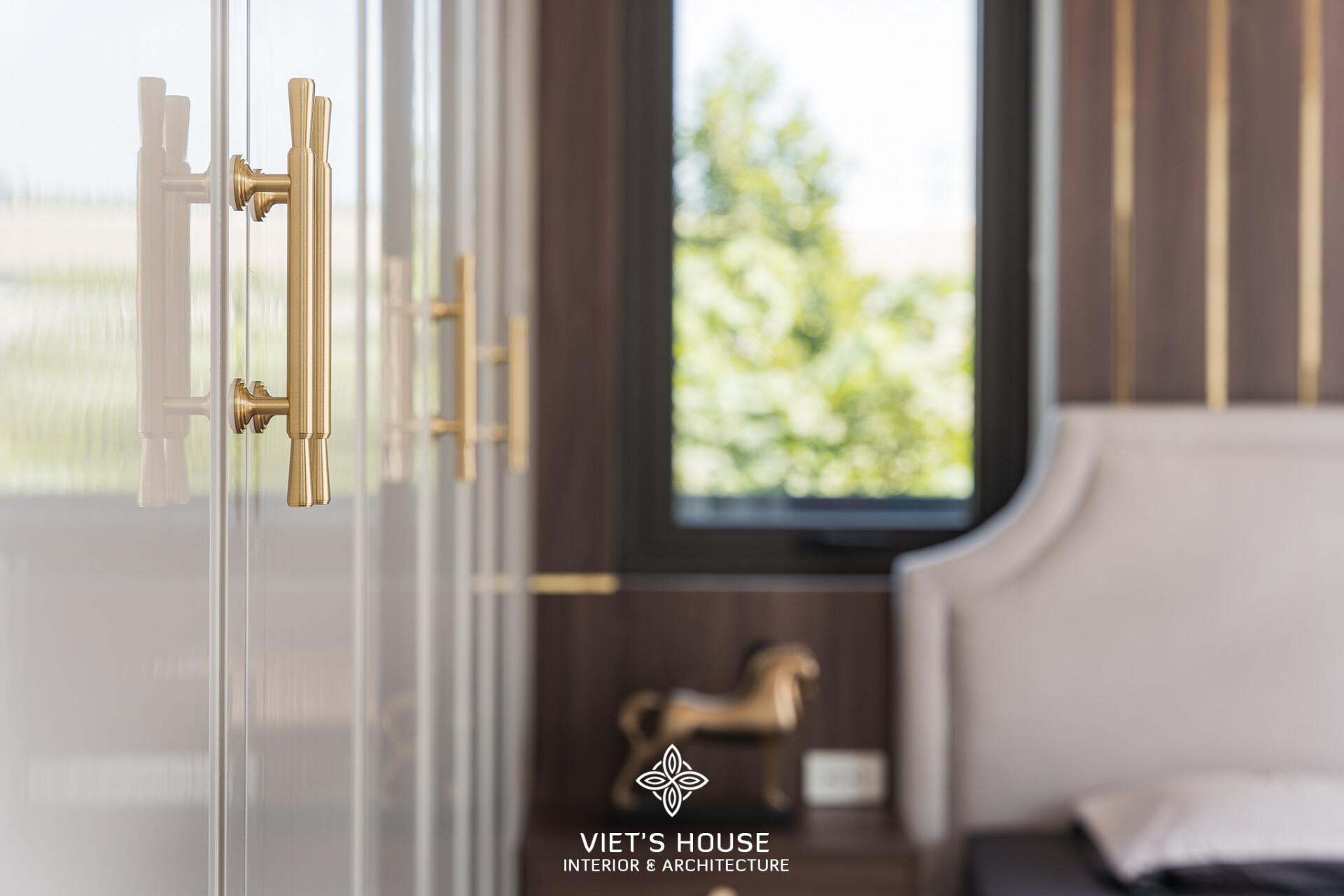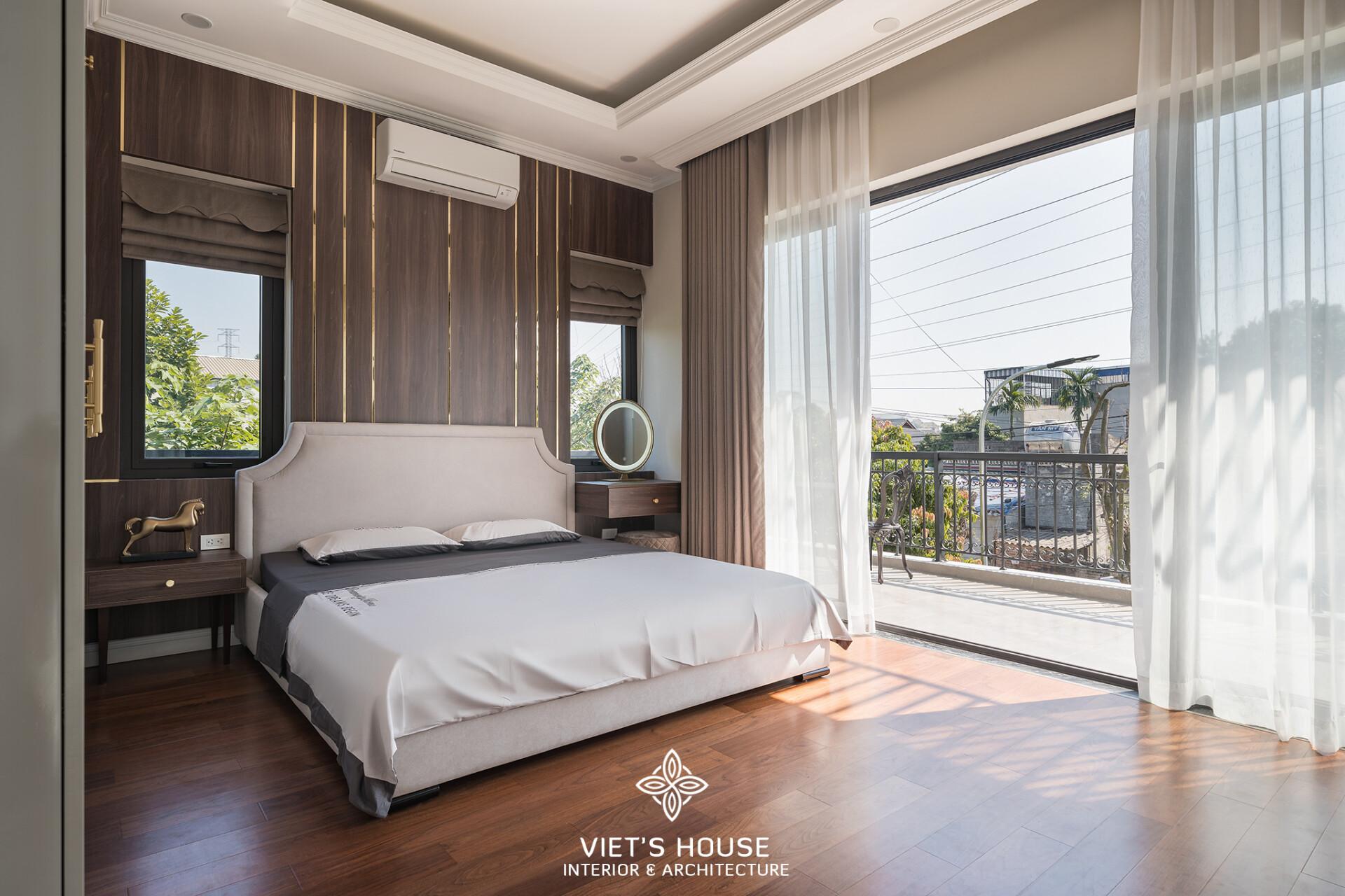 Phòng ngủ - sự an yên riêng tư: Phòng ngủ sử dụng gam trung tính, sàn gỗ ấm áp, chi tiết mạ vàng tinh tế. Giường lớn hướng ra ban công ngập tràn ánh sáng tự nhiên, mang lại cảm giác thư giãn, riêng tư nhưng vẫn sang trọng. Đây là nơi gia chủ tìm lại sự cân bằng sau những ngày bận rộn.