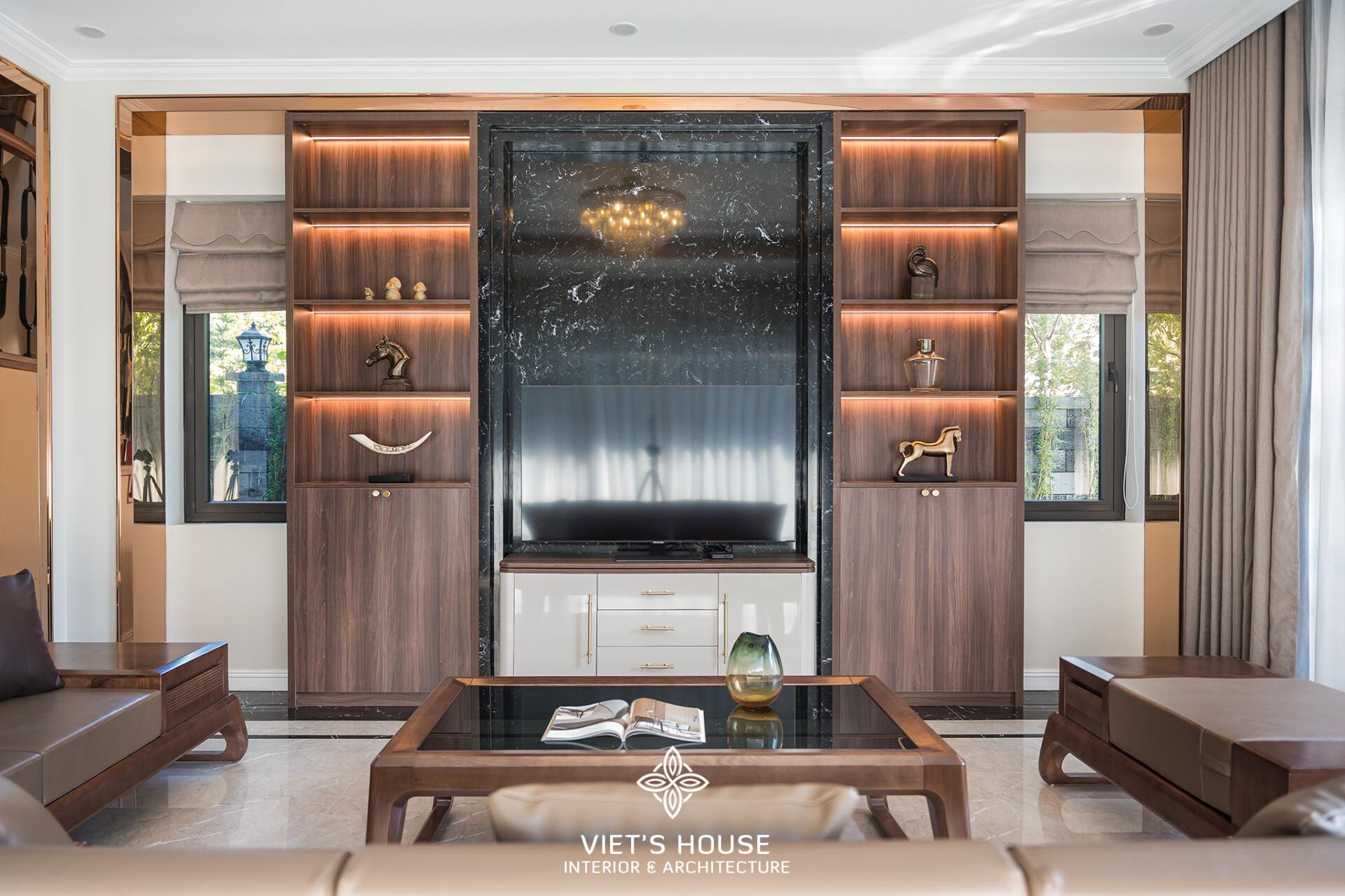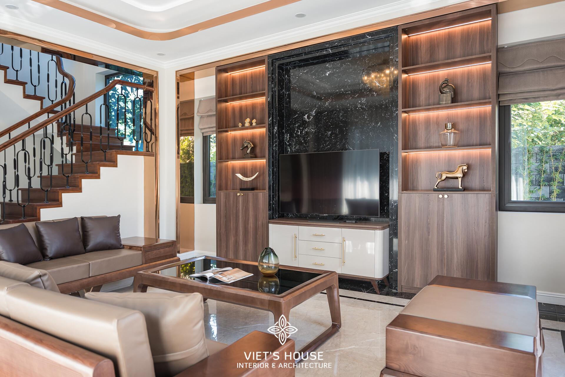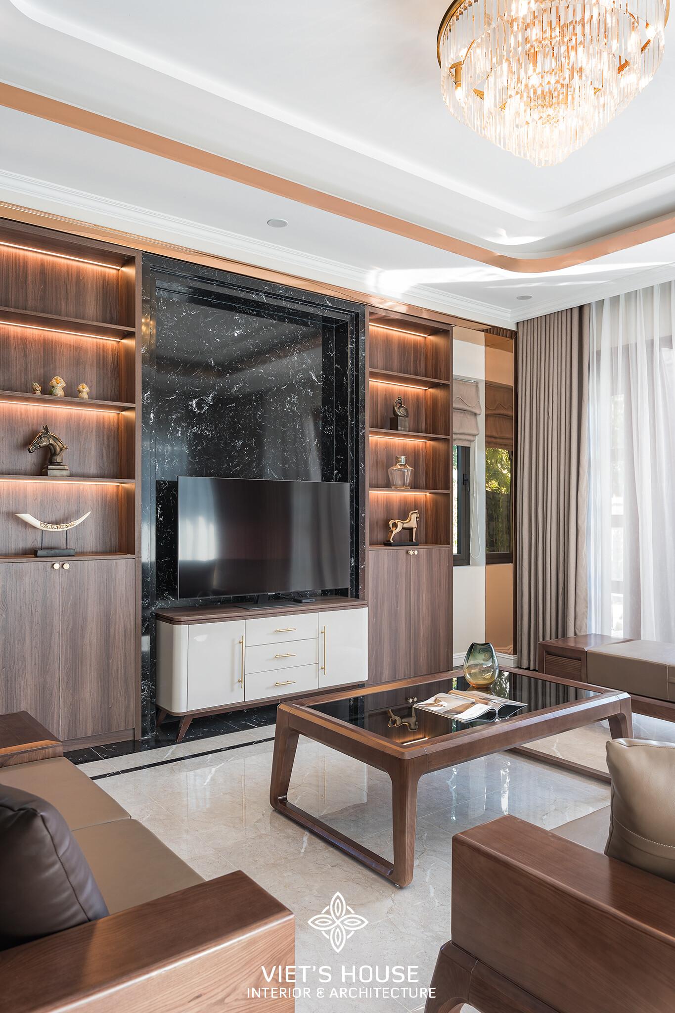 Phòng khách nhìn cận vào khu kệ tivi, nhấn mạnh sự kết hợp hài hòa giữa gỗ và đá sang trọng.