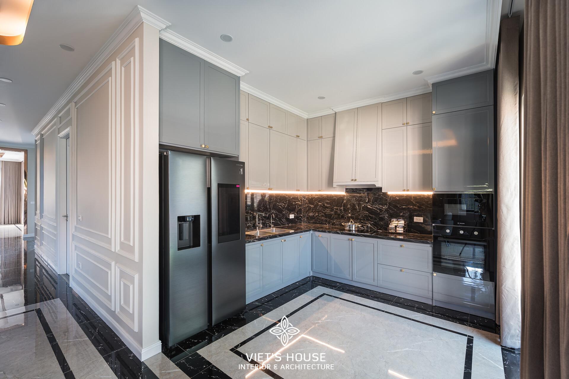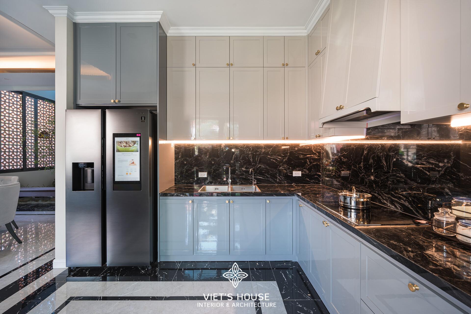 Khu bếp hiện đại với hệ tủ trên dưới và mặt bếp đá đen vân mây.