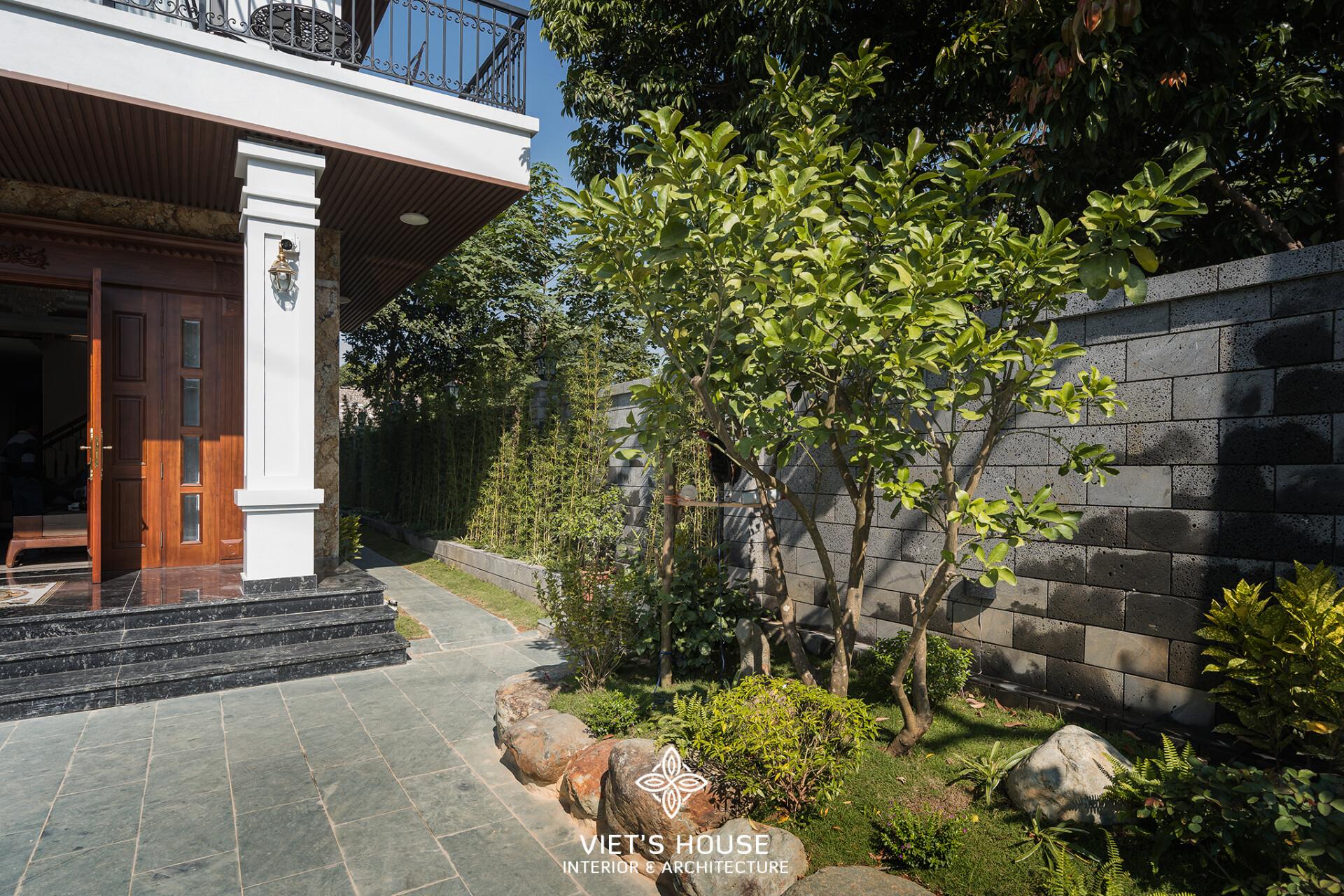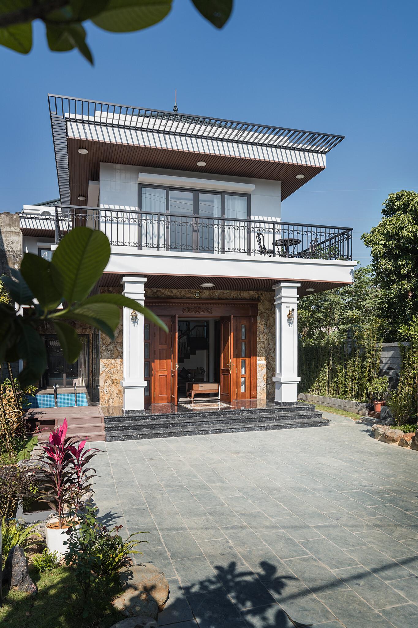 Ngoại thất - thiên nhiên trong tầm tay: Biệt thự 2 tầng nổi bật với mặt tiền khỏe khoắn, mái lệch hiện đại và ban công rộng thoáng. Khoảng sân lát đá xám kết hợp tiểu cảnh xanh cùng hồ bơi nhỏ mang lại không khí trong lành, là nơi thư giãn ngoài trời lý tưởng cho cả gia đình.