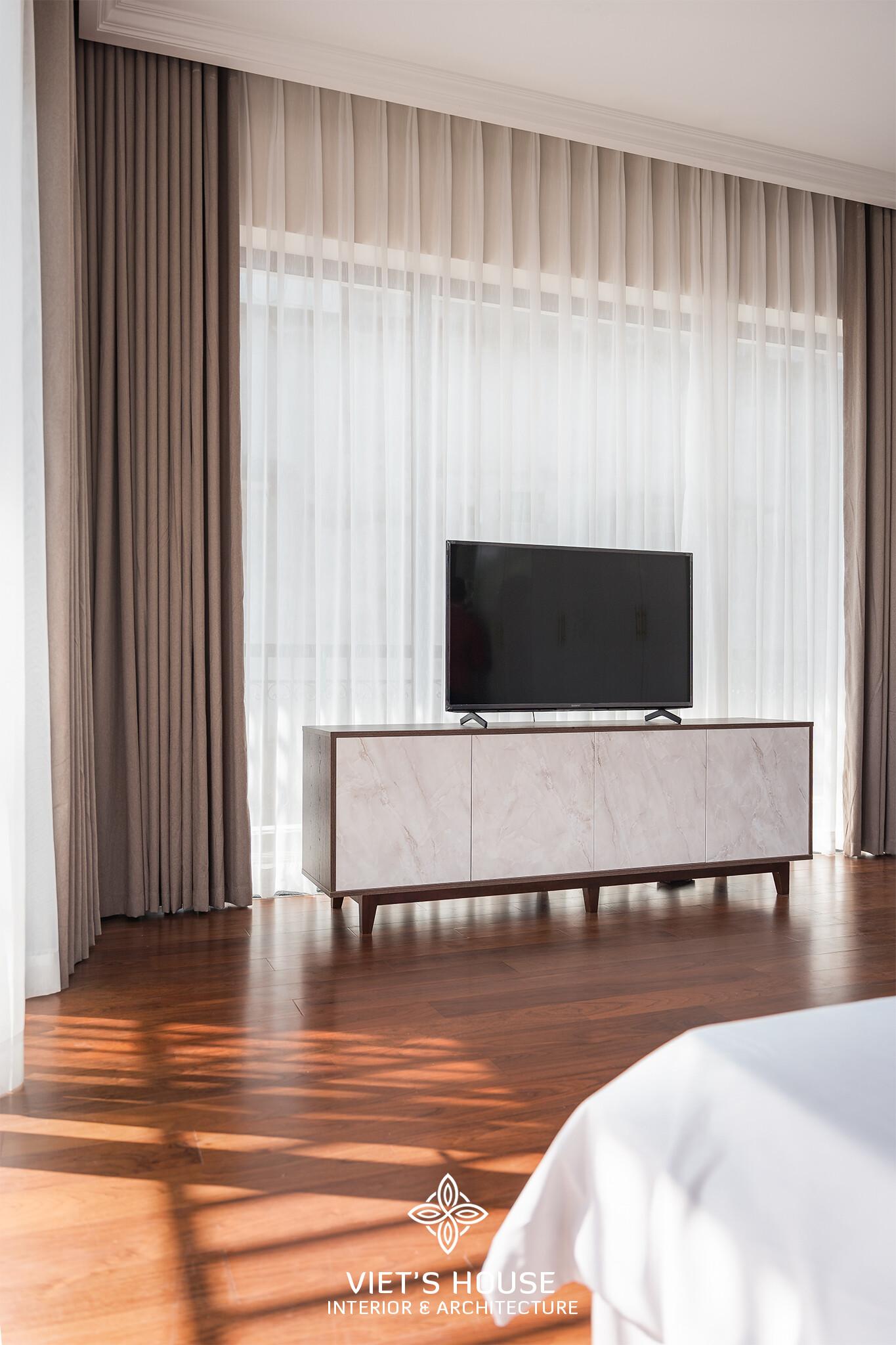 Kệ tivi vân đá sáng màu kết hợp rèm hai lớp tinh tế.