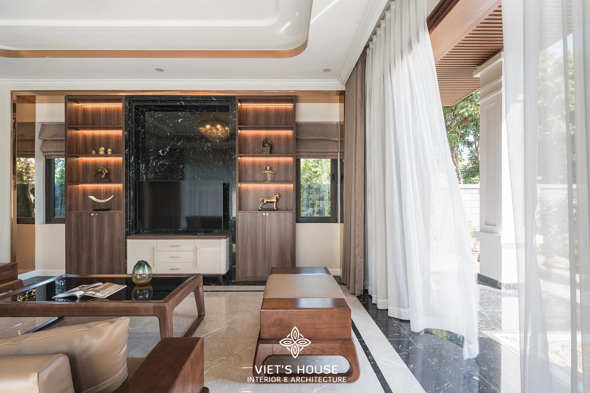 Khu vực tủ kệ tivi ốp đá kết hợp gỗ, cửa kính kéo rèm nhẹ tạo cảm giác thoáng sáng.
