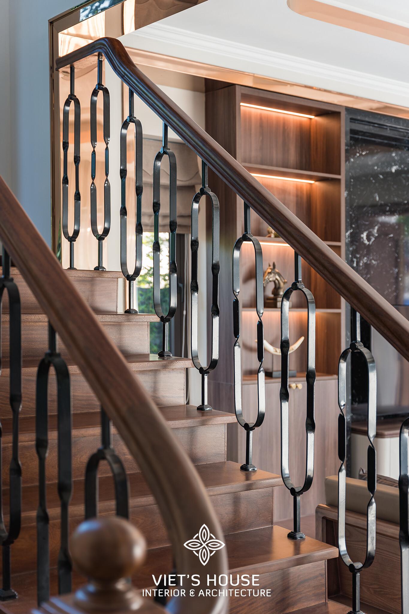 Chi tiết cầu thang gỗ cùng tay vịn kim loại uốn cong tạo điểm nhấn mạnh mẽ.