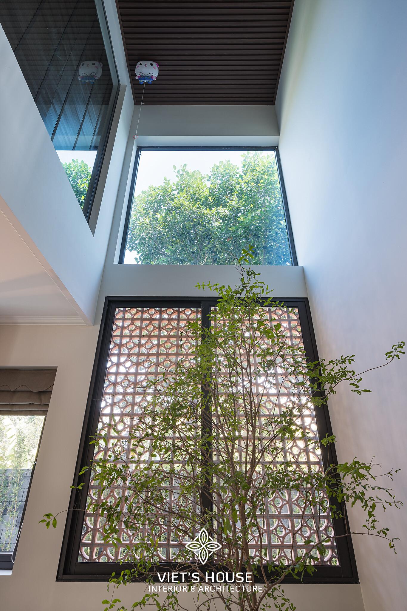 Cửa sổ cao, cây xanh mang ánh sáng tự nhiên vào không gian.