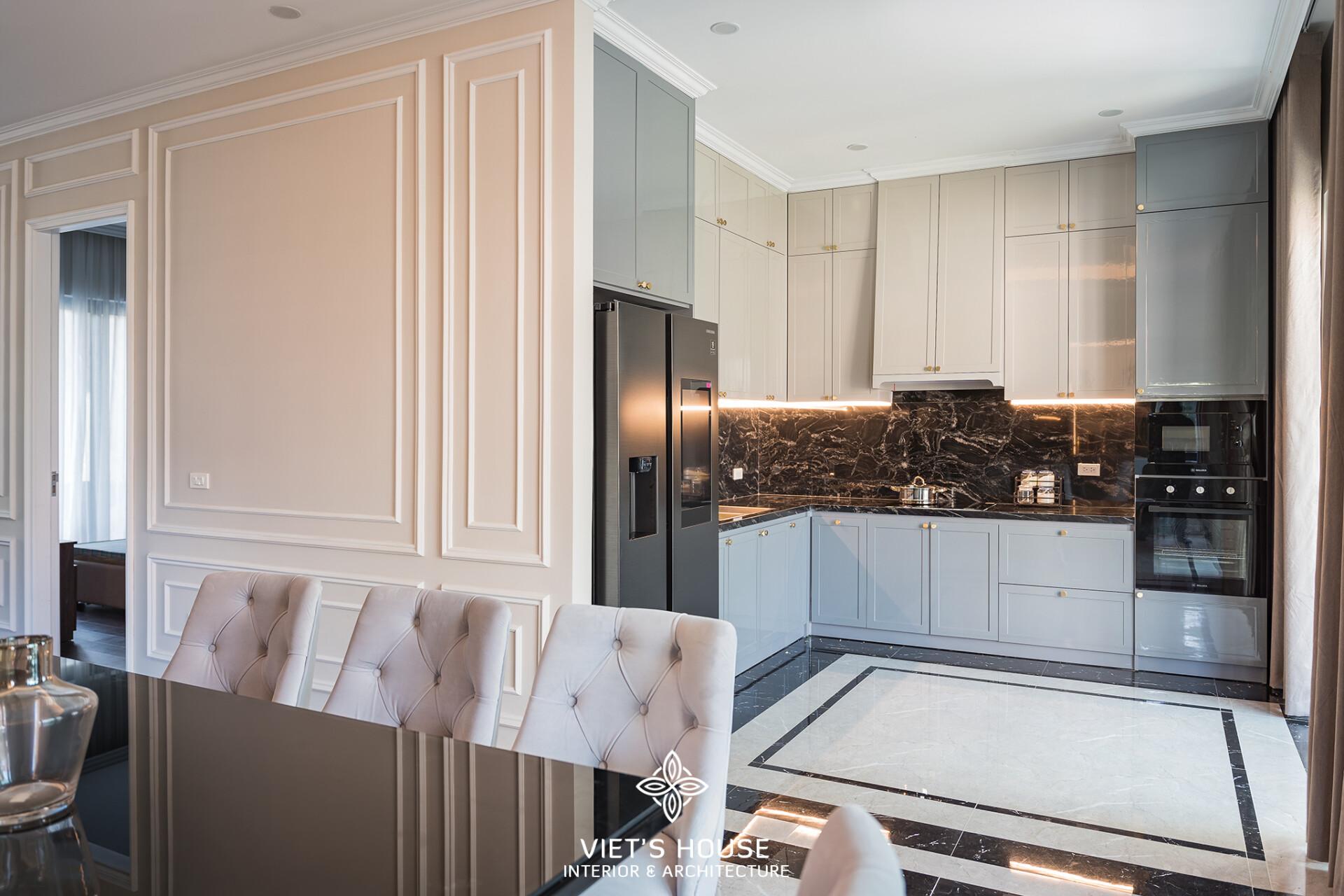 Bếp chữ L hiện đại, gam màu ghi xám kết hợp đá marble sang trọng.