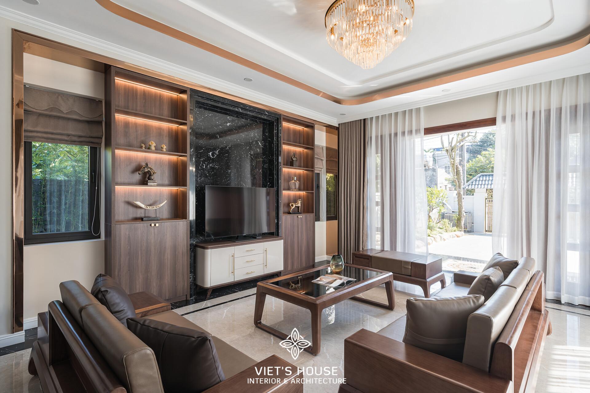 Phòng khách với hệ tủ kệ ốp đá đen sang trọng, sofa gỗ bọc da và cửa kính lớn tràn ngập ánh sáng.