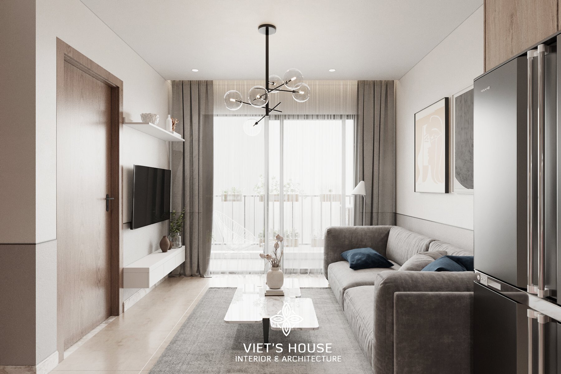 Phòng khách với sofa xám, bàn trà nhỏ và cửa kính lớn đón sáng tự nhiên.