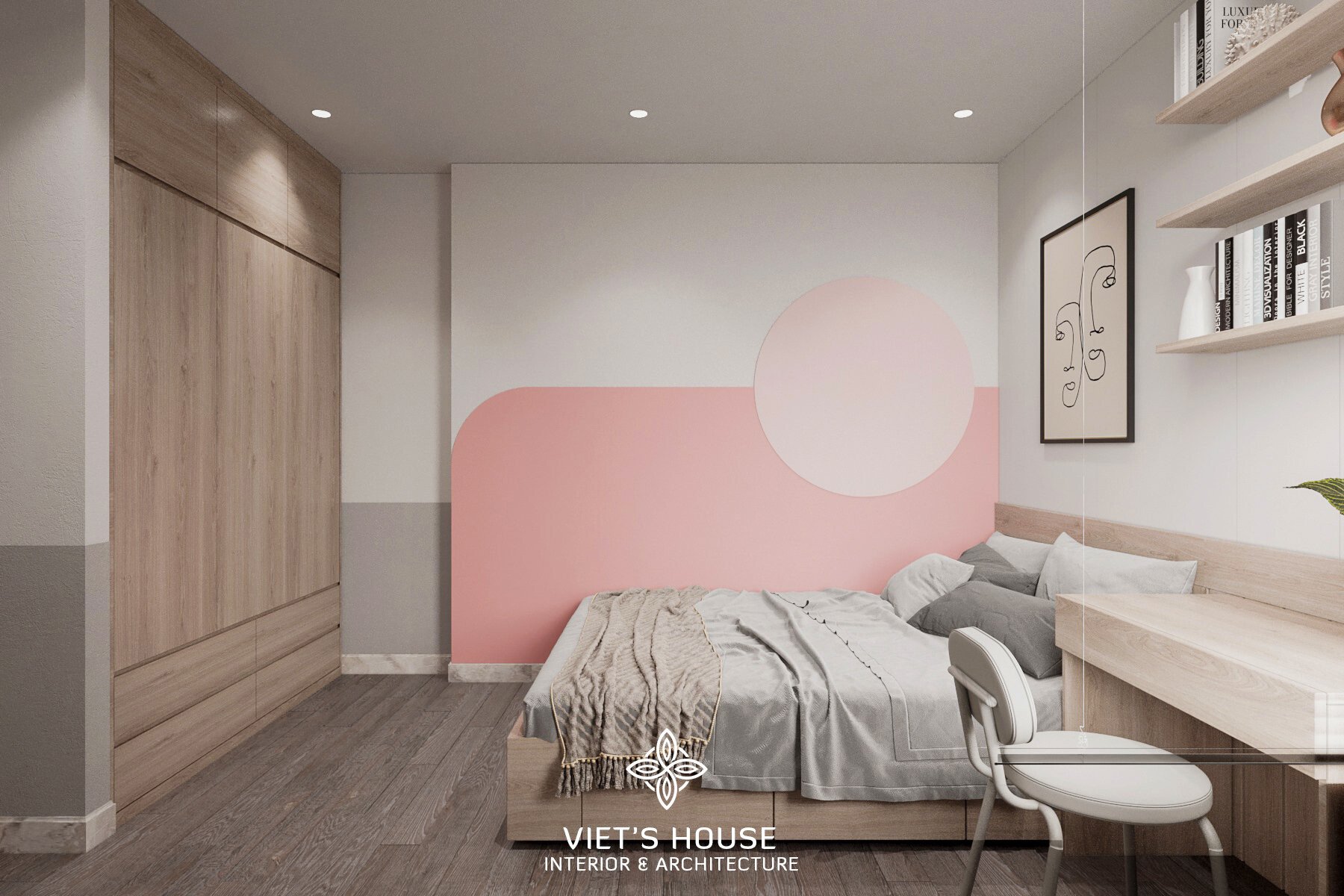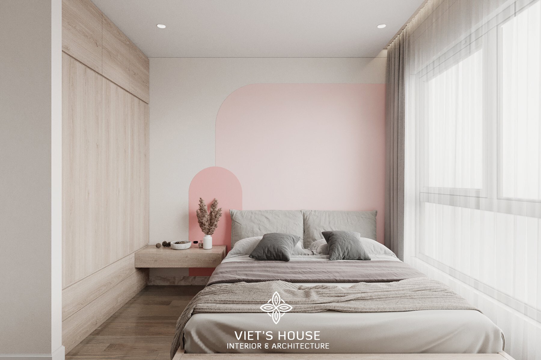 Tủ âm tường gỗ sáng màu kết hợp mảng tường hồng tạo nên một căn phòng vừa hiện đại vừa gần gũi.