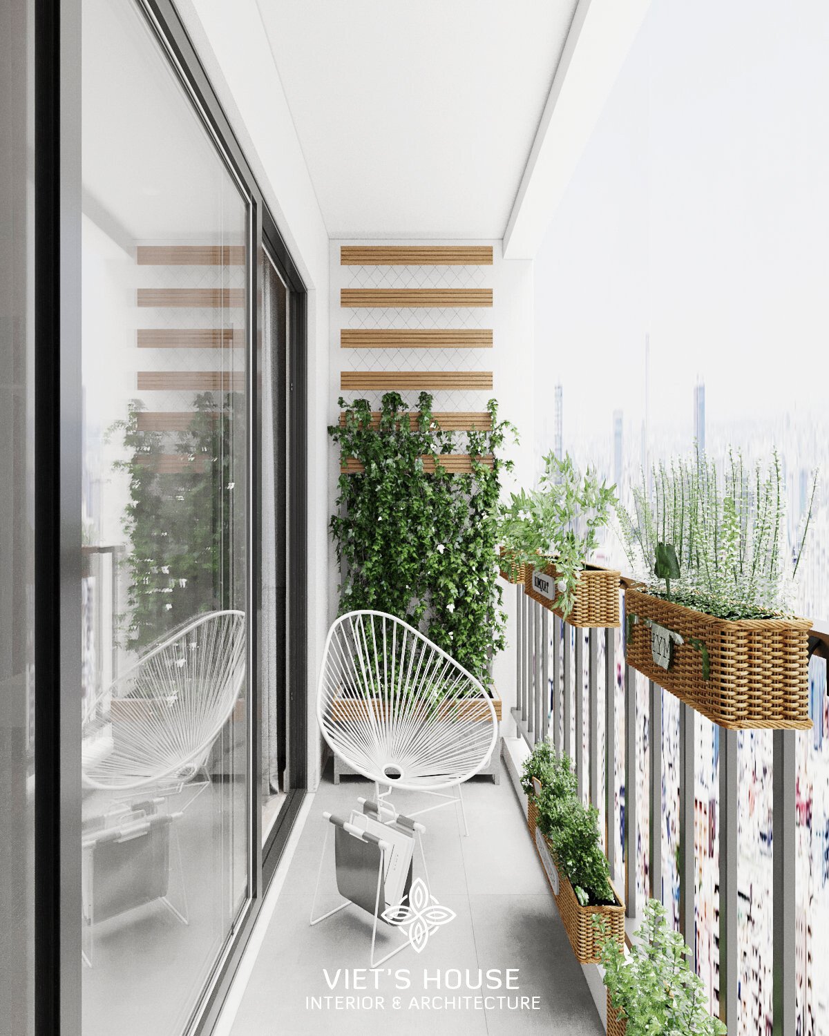 Ban công ngập tràn cây xanh và ánh sáng, được bố trí ghế thư giãn để tận hưởng bầu không khí trong lành.