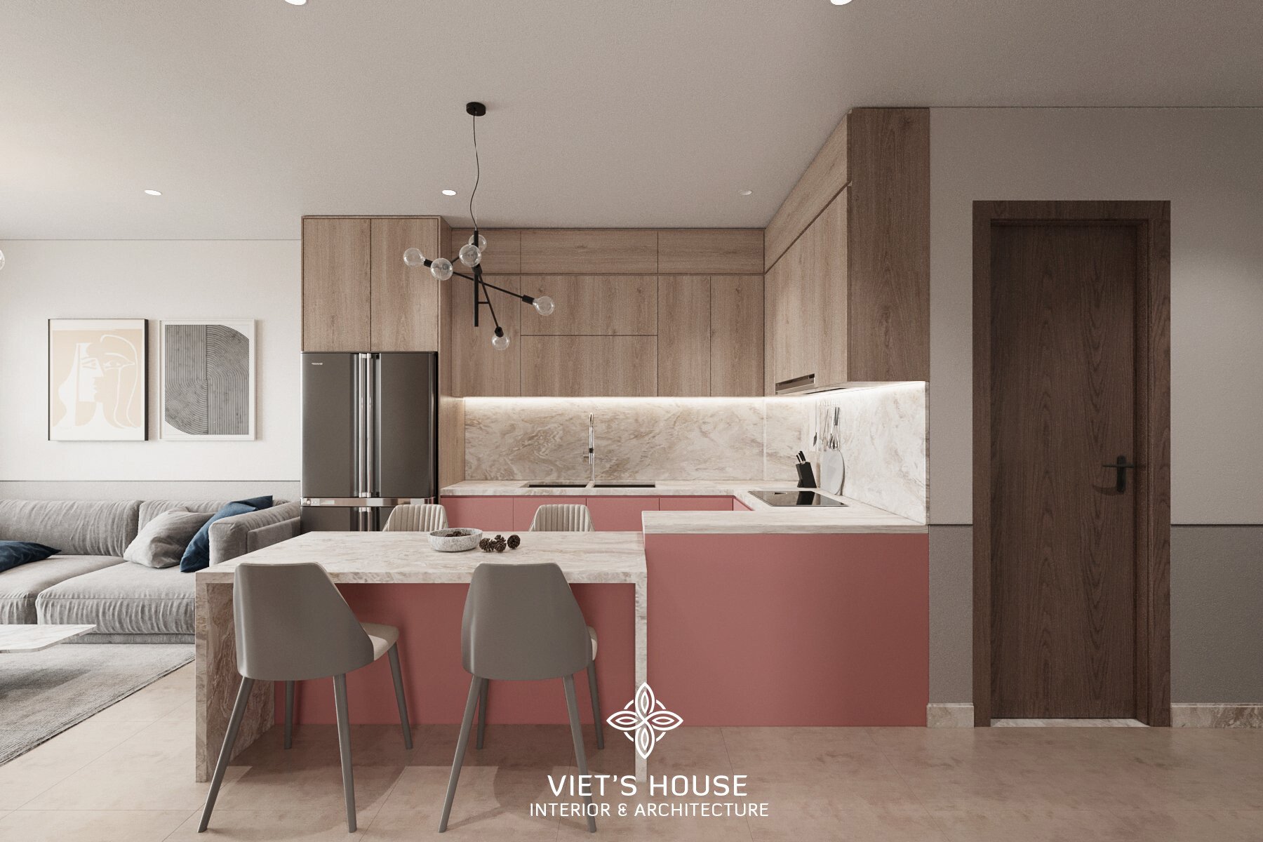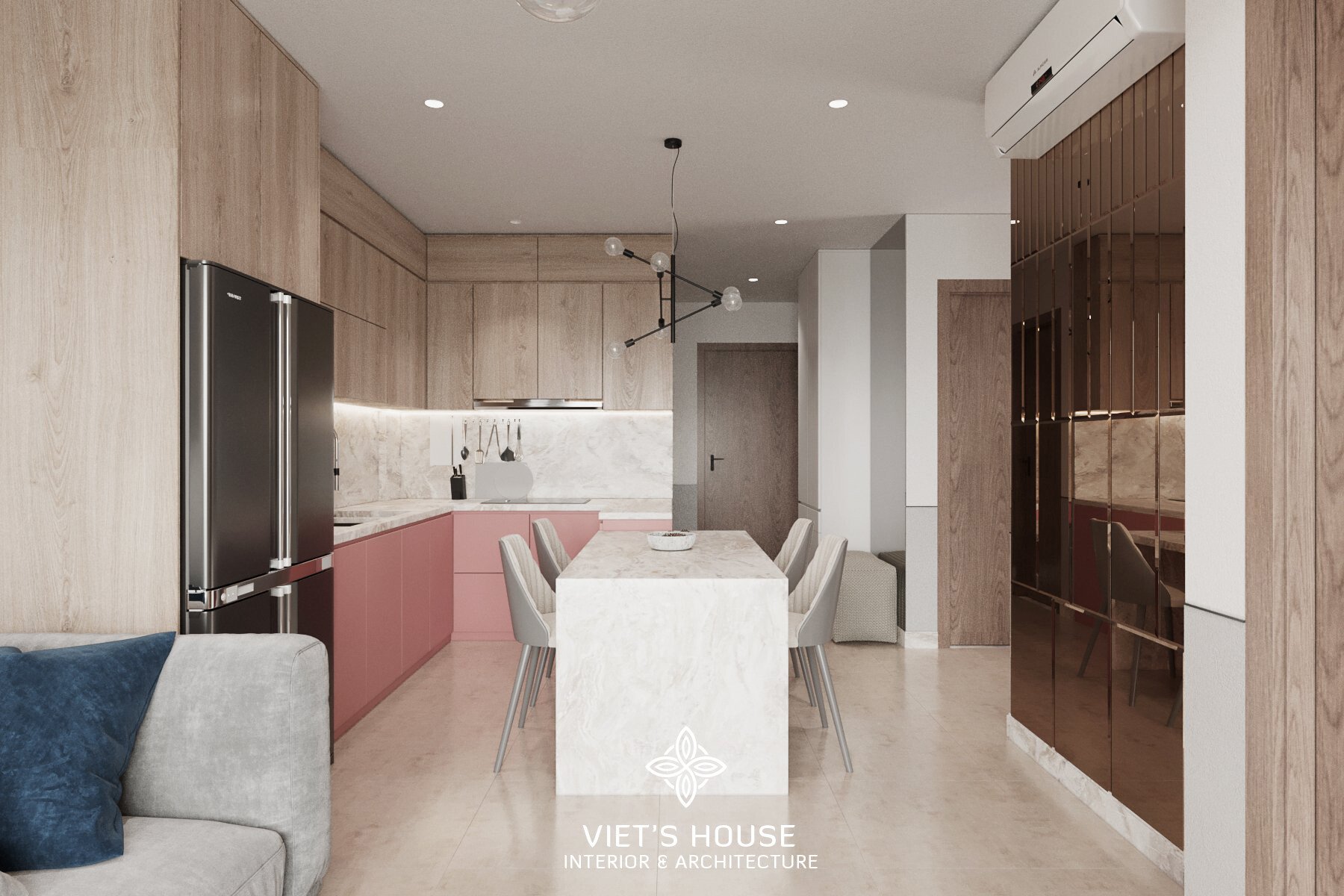 Không gian bếp kết hợp bàn ăn với tông gỗ sáng, đá marble và điểm nhấn hồng pastel.
