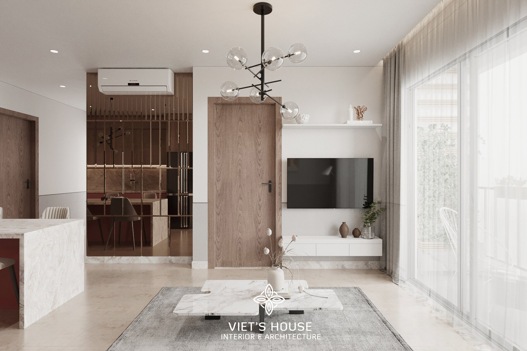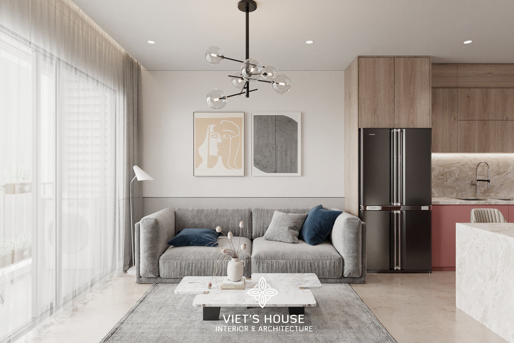 Khách & bếp - giai điệu kết nối: Phòng khách với sofa xám, bàn trà đá nhỏ, kệ TV tối giản và cửa kính lớn tràn ánh sáng. Liền mạch với đó là khu bếp hiện đại với hệ tủ gỗ sáng, mặt đá trắng và bàn đảo kết hợp bàn ăn. Không gian mở này trở thành trung tâm của căn hộ, nơi cả gia đình cùng quây quần và sẻ chia.