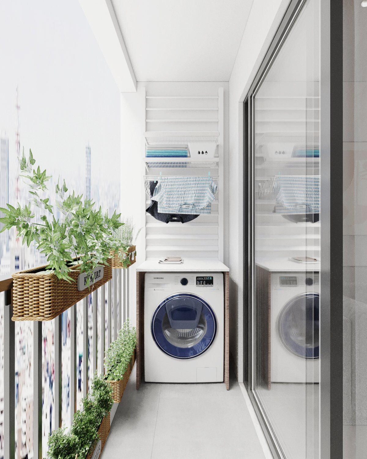 Ban công & giặt phơi - khoảng xanh yên bình: Ban công nhỏ được bố trí cây xanh và ghế ngồi, là góc thư giãn ngoài trời lý tưởng. Không gian giặt phơi và máy giặt được sắp xếp hợp lý, giữ căn hộ gọn gàng và tiện lợi.