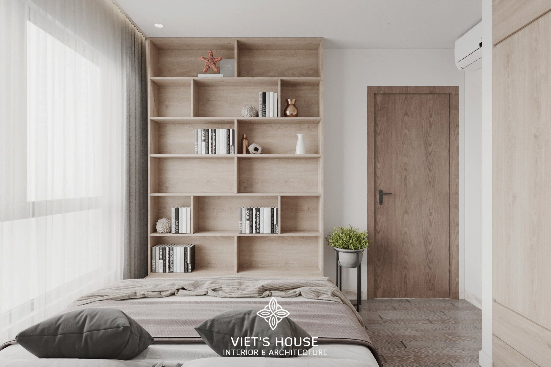 Giá sách gỗ cao kịch trần trở thành điểm nhấn tinh tế ngay sau đầu giường, vừa tiện lợi vừa sang trọng.