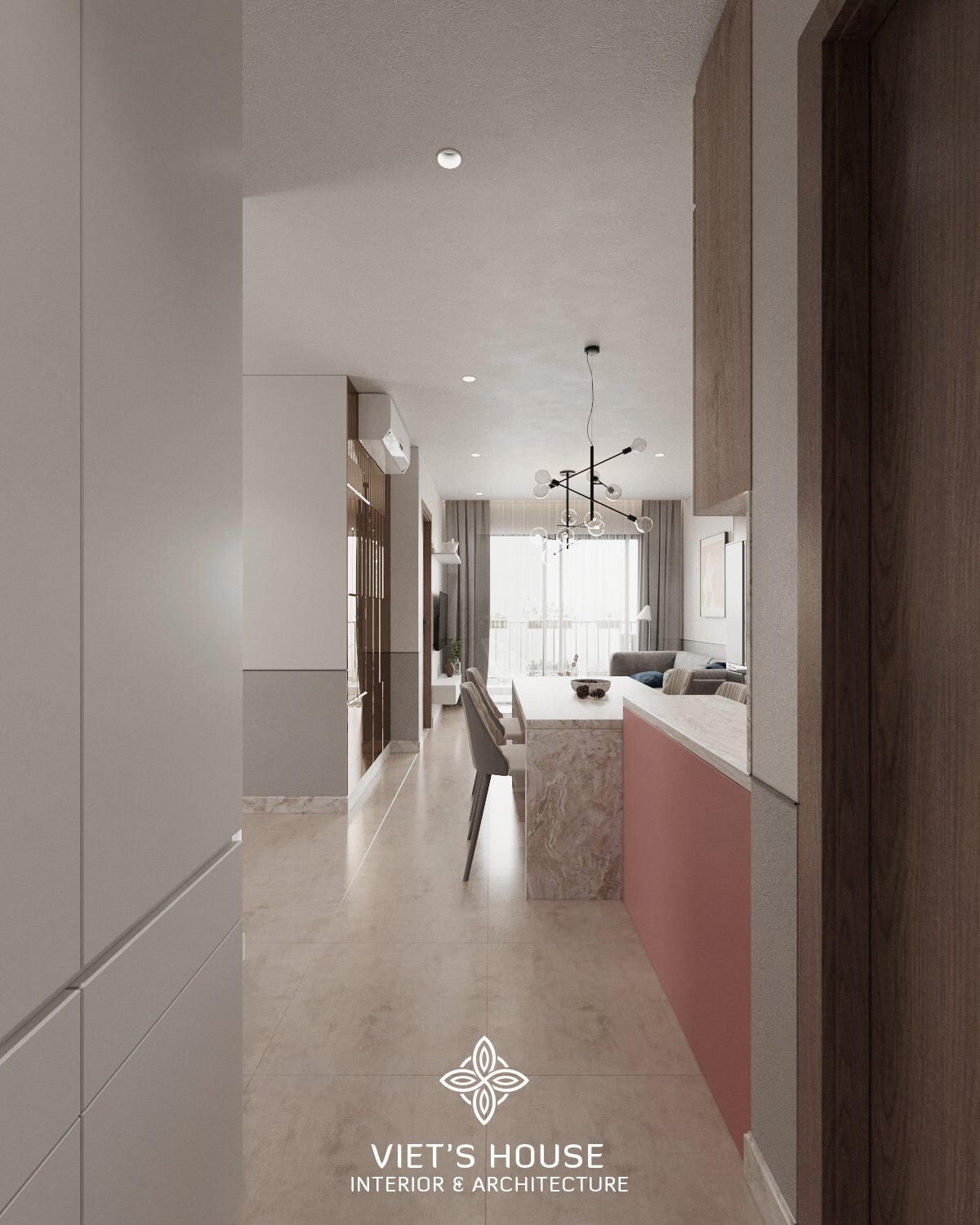 Góc nhìn từ hành lang vào bếp – bàn ăn, tạo cảm giác gọn gàng và ấm cúng.