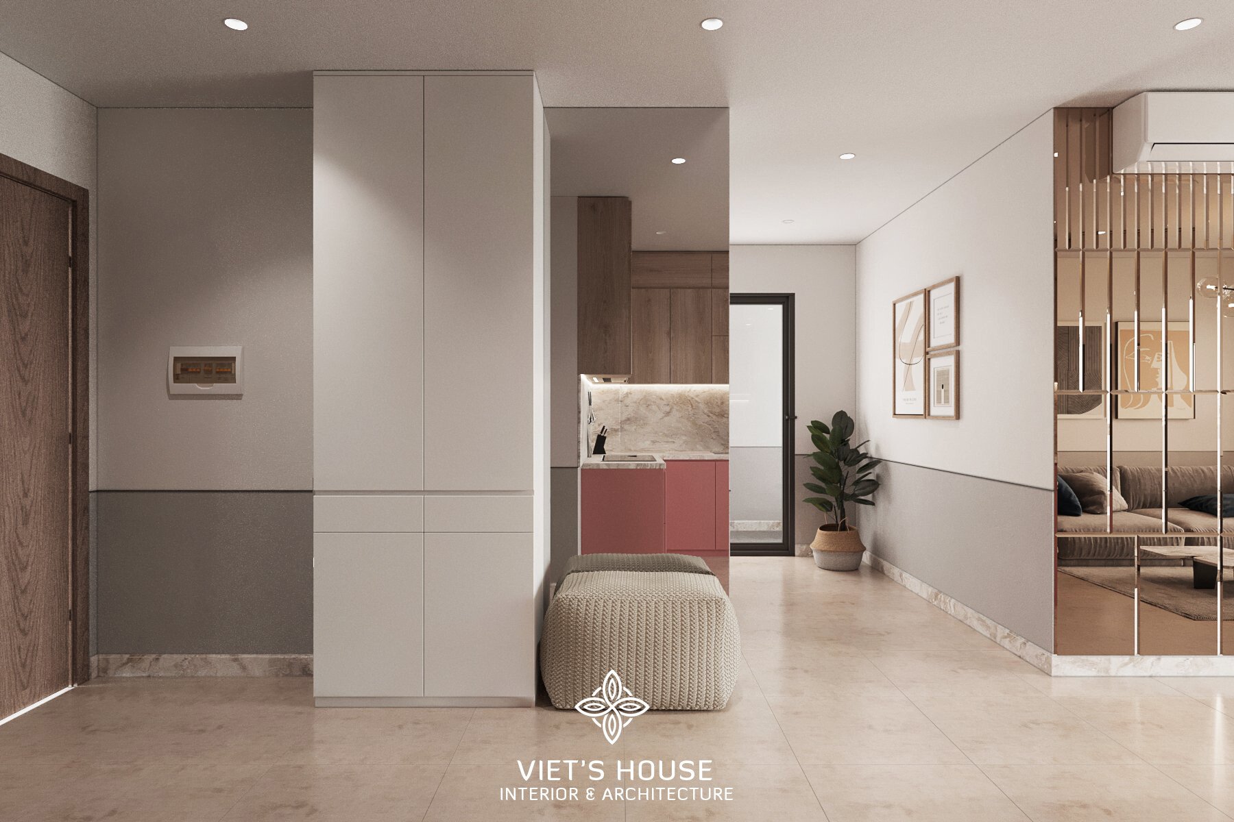 Khu vực sảnh vào với tủ âm tường, ghế ngồi nhỏ và góc nhìn hướng về bếp.