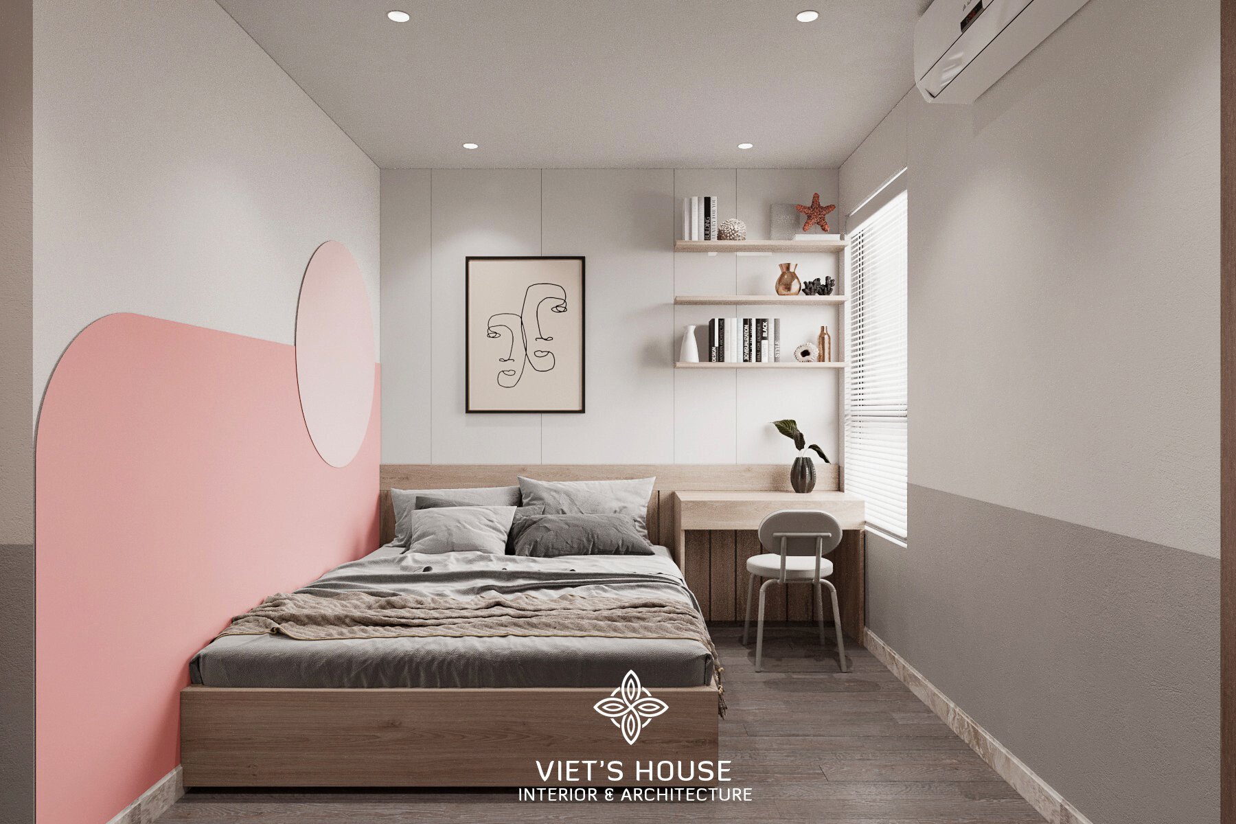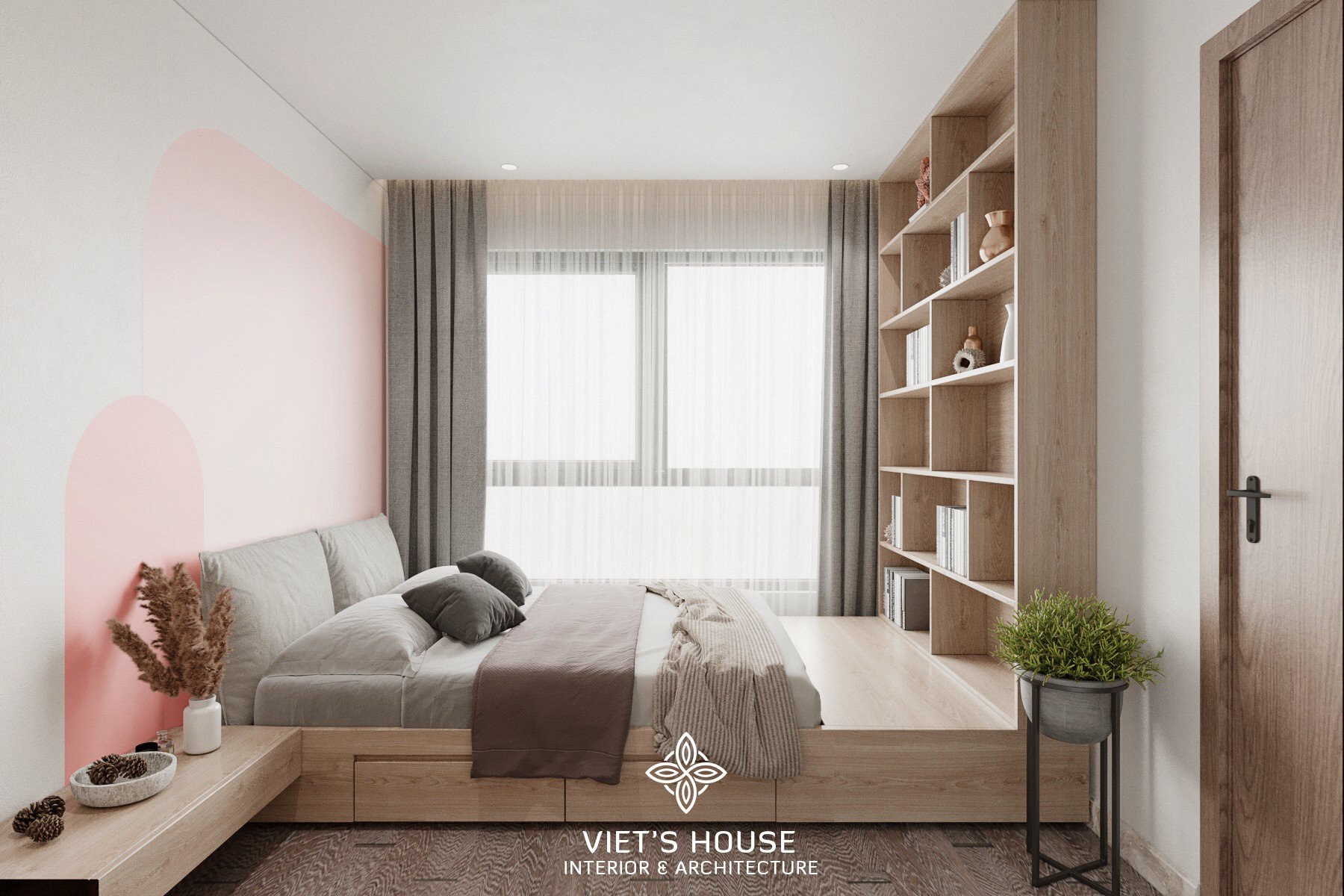 Phòng ngủ - góc nhỏ nuôi dưỡng cảm xúc: Giường thấp, tủ âm tường và giá sách kịch trần mang đến sự gọn gàng. Mảng tường bo cong mềm mại cùng gam màu pastel nhẹ nhàng tạo cảm giác trẻ trung, thư giãn, đồng thời ánh sáng tự nhiên từ cửa sổ lớn giúp không gian luôn tươi mới.