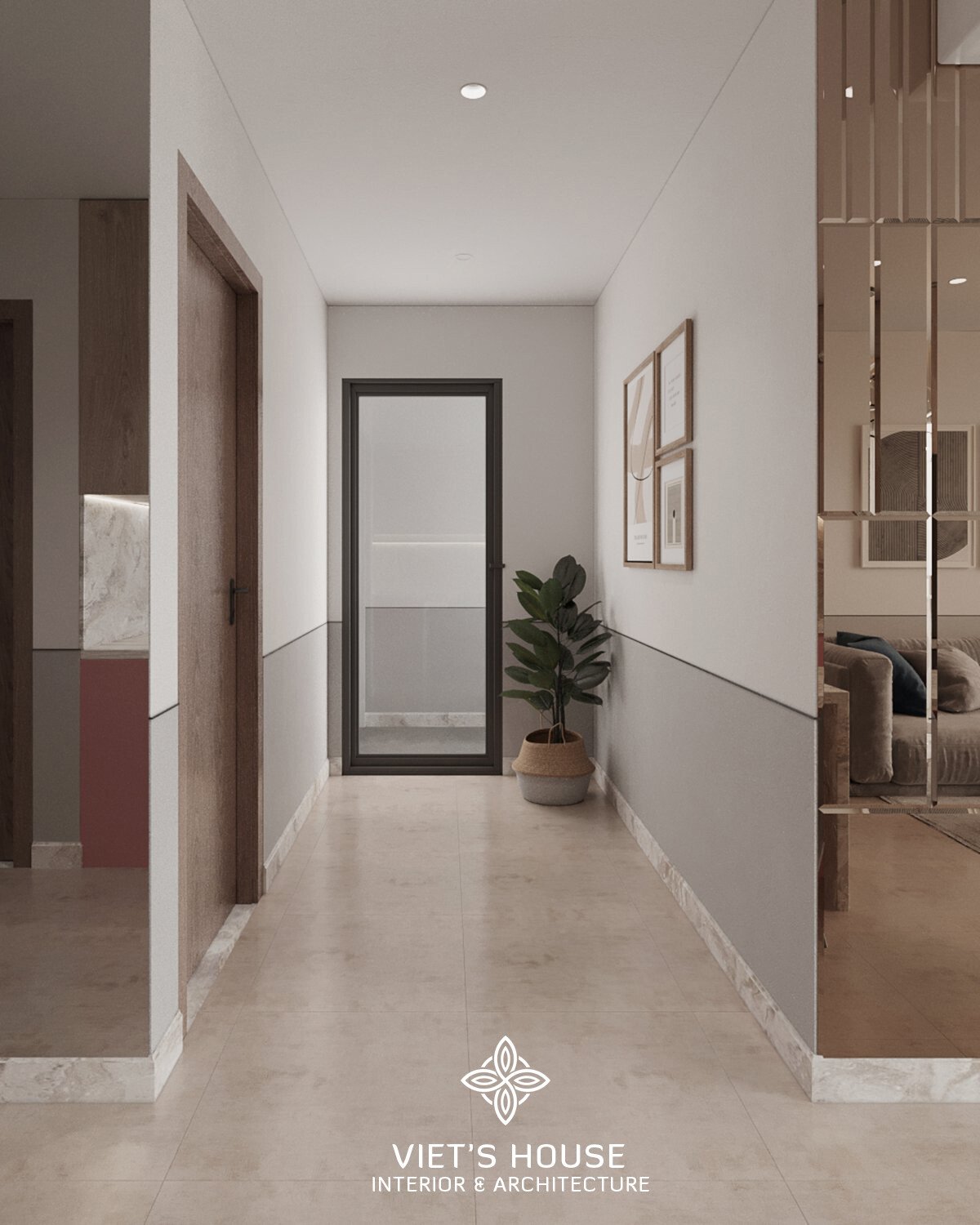 Góc nhìn hành lang nối liền phòng khách và bếp, tạo sự liên thông không gian.