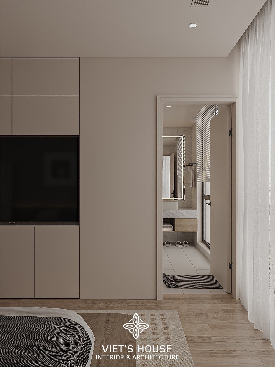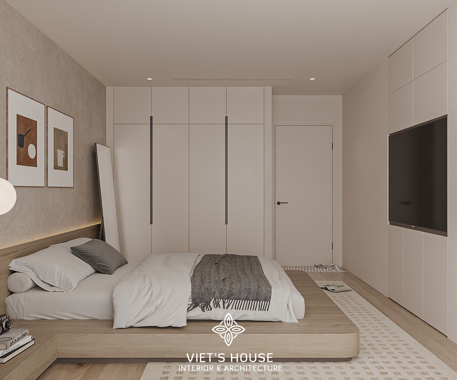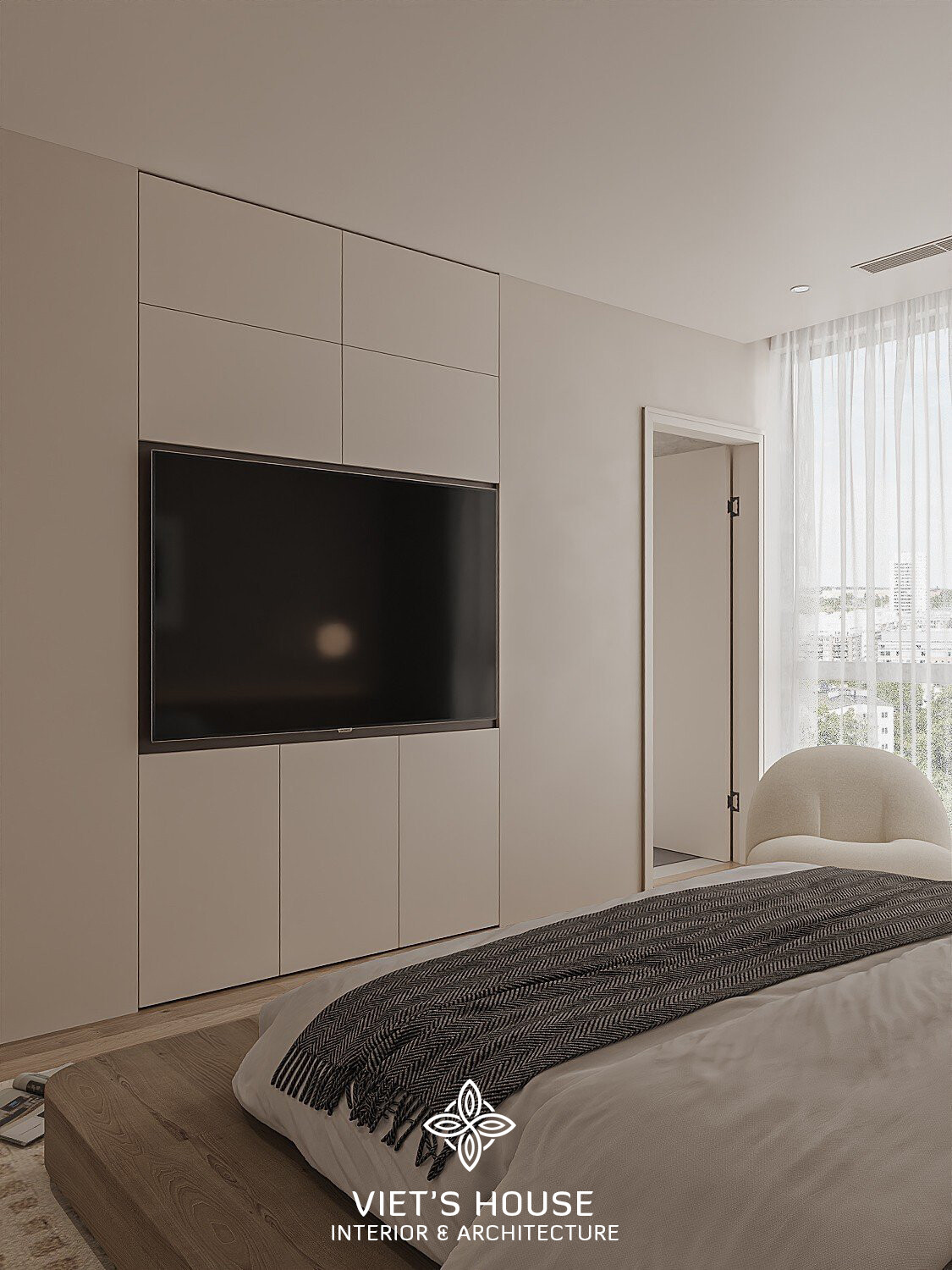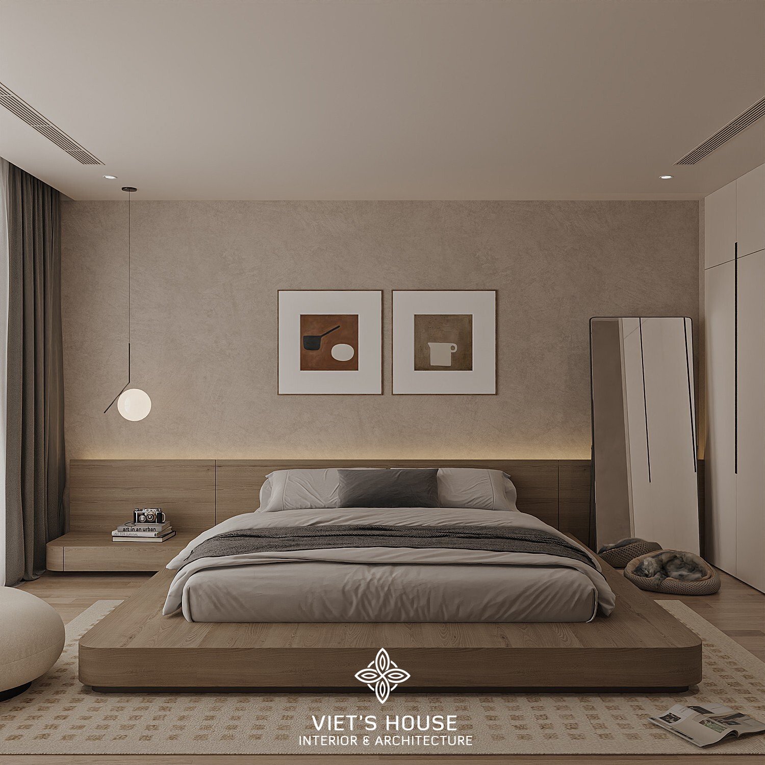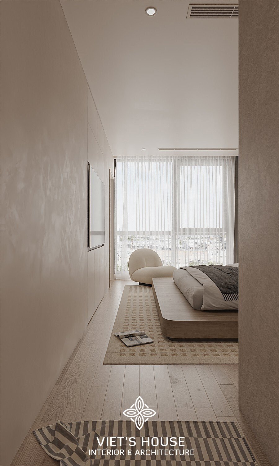 Phòng ngủ master - góc nghỉ ngơi riêng tư: Giường lớn, tone màu trung tính, ánh sáng tự nhiên từ cửa kính và nội thất tối giản. Đây là nơi để gia chủ buông bỏ áp lực, tìm lại sự cân bằng sau ngày dài làm việc.