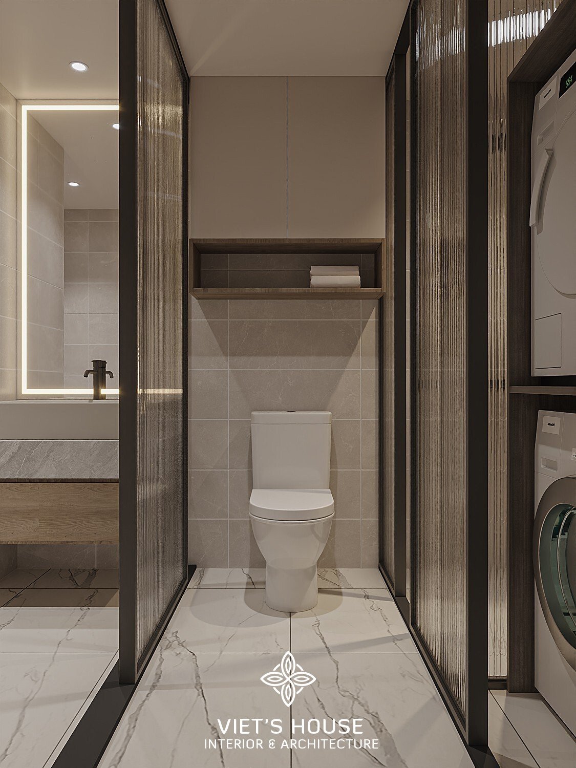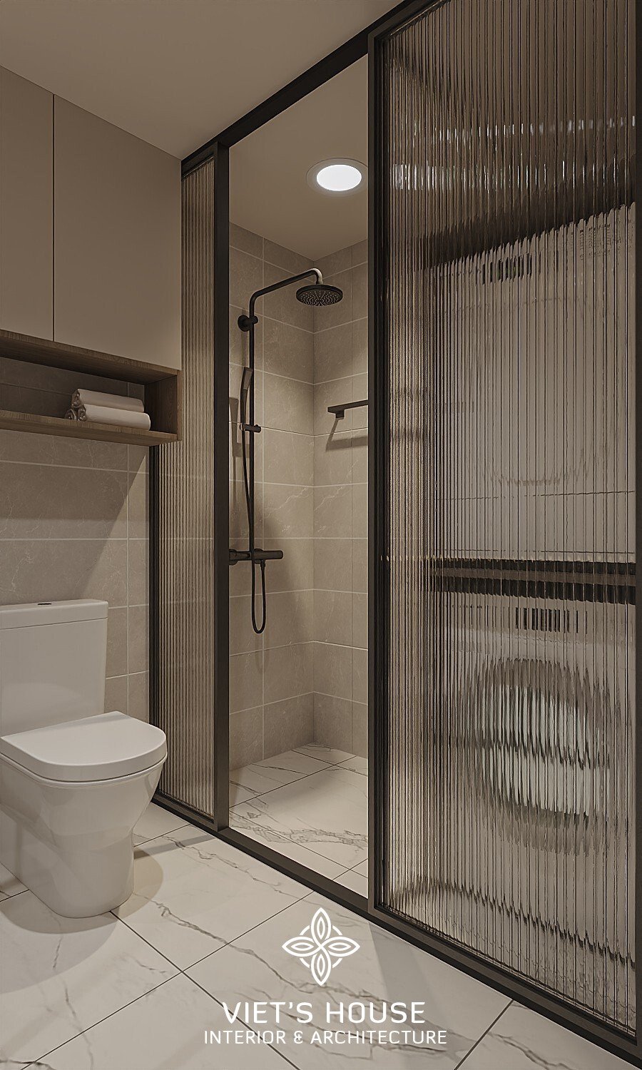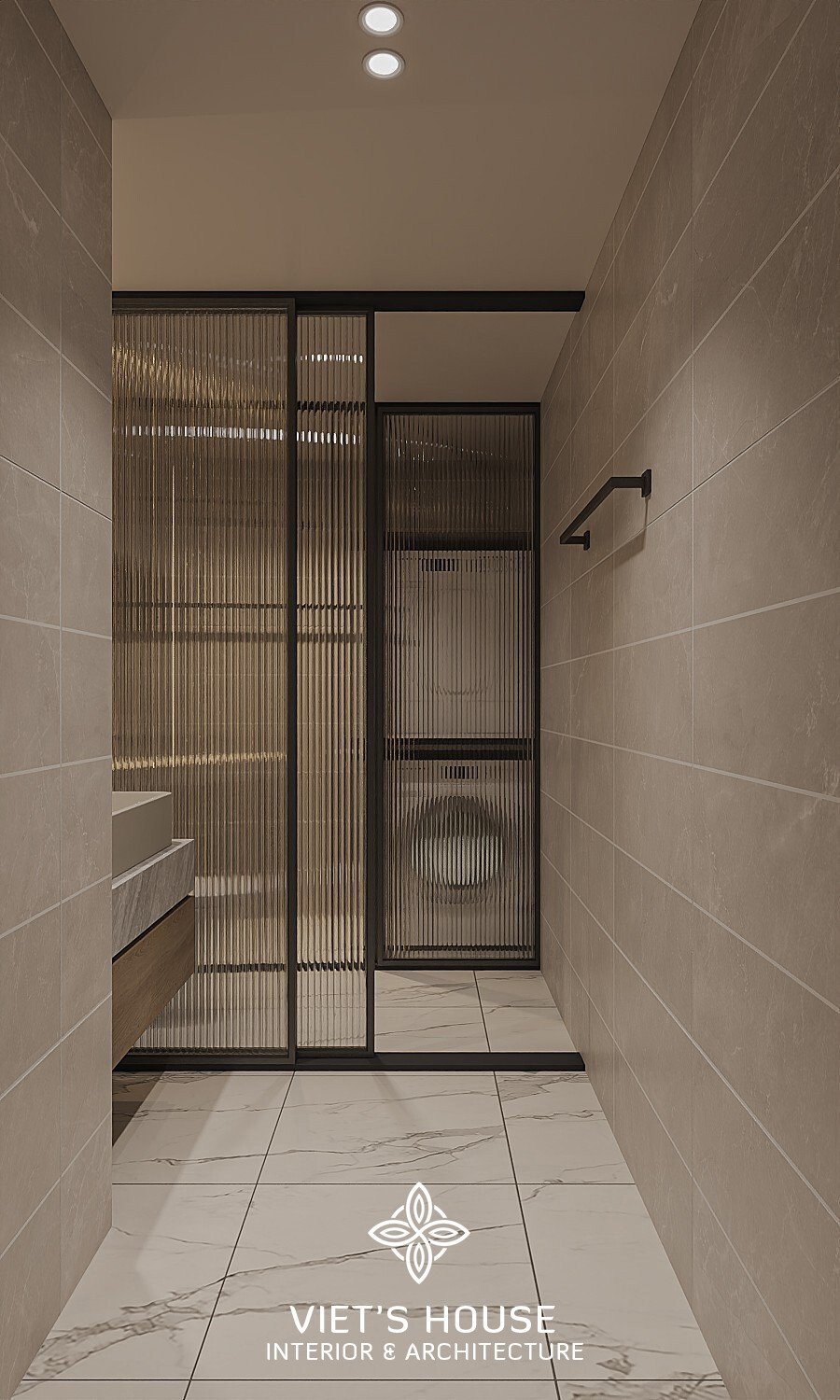 Phòng vệ sinh – khoảng nghỉ tiện nghi: Ốp đá sáng, thiết kế gọn gàng với vách kính và ánh sáng tự nhiên. Đây là không gian nhỏ nhưng quan trọng, mang đến sự thoải mái và sạch sẽ, giúp gia chủ tái tạo năng lượng trước và sau một ngày dài.