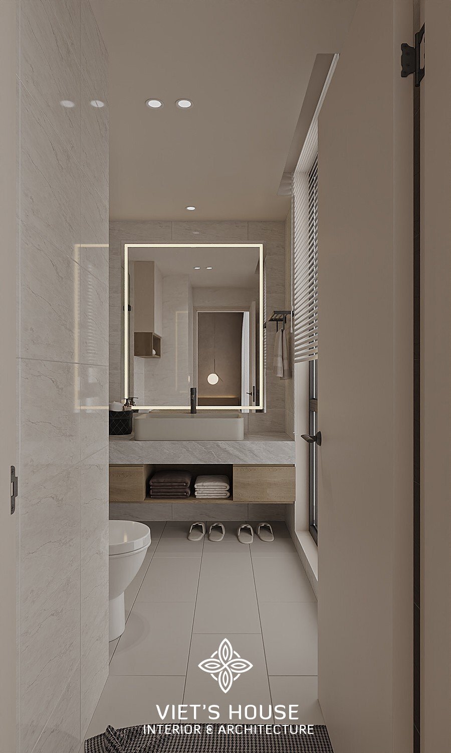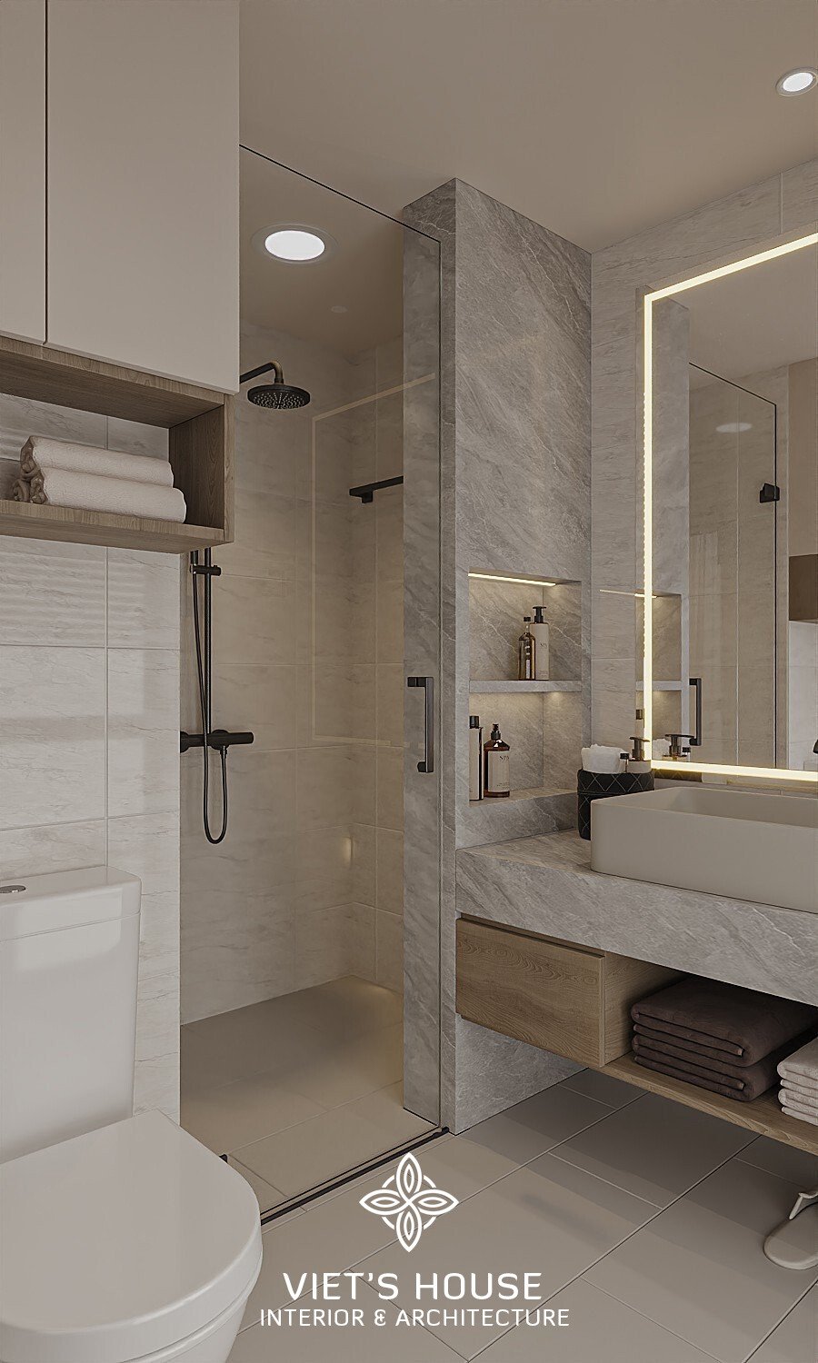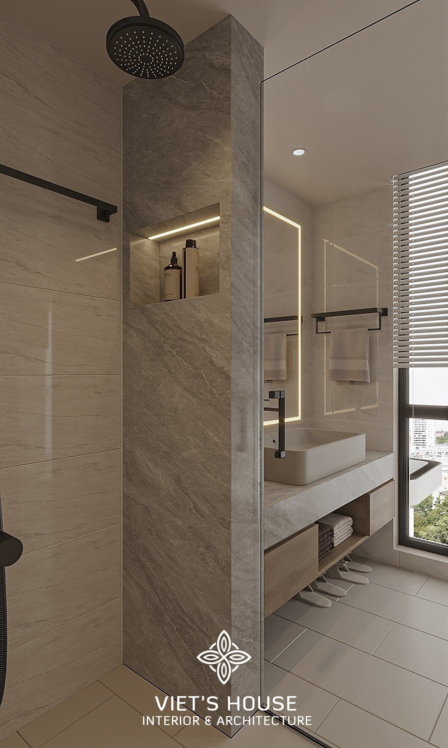 Phòng vệ sinh – khoảng nghỉ tiện nghi: Ốp đá sáng, thiết kế gọn gàng với vách kính và ánh sáng tự nhiên. Đây là không gian nhỏ nhưng quan trọng, mang đến sự thoải mái và sạch sẽ, giúp gia chủ tái tạo năng lượng trước và sau một ngày dài.