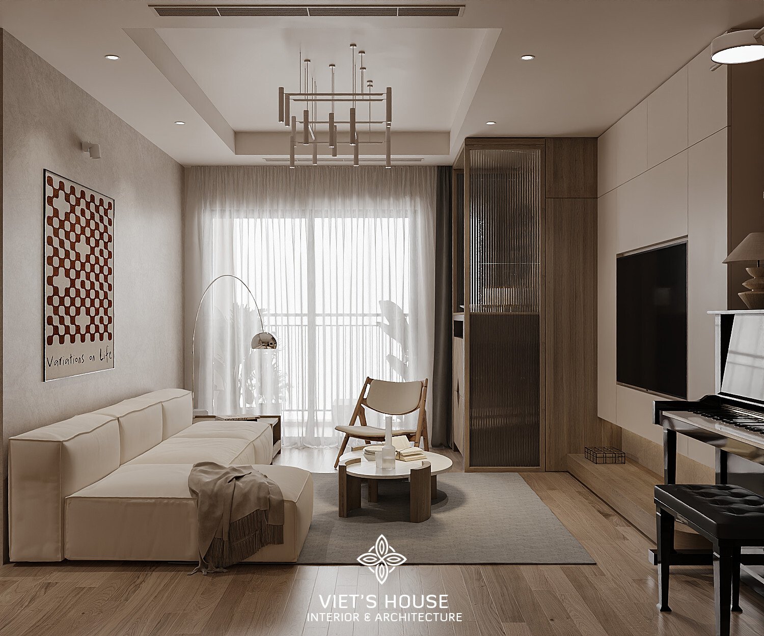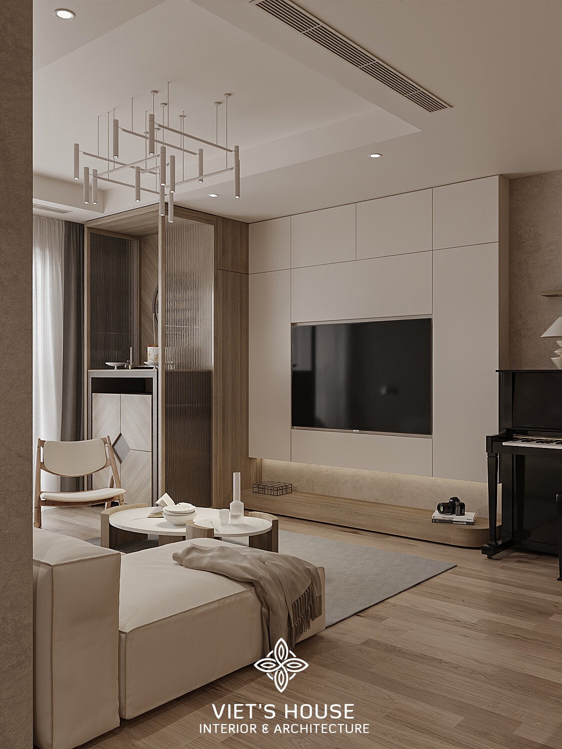 Phòng khách sang trọng với sofa sáng màu và TV treo tường hiện đại.