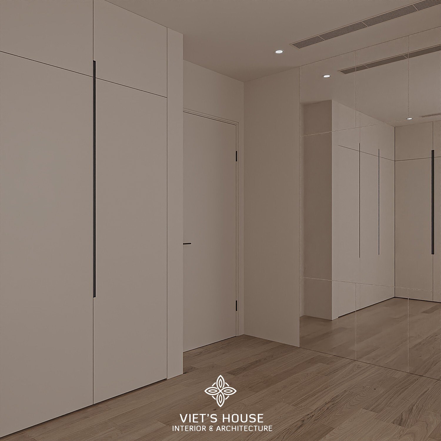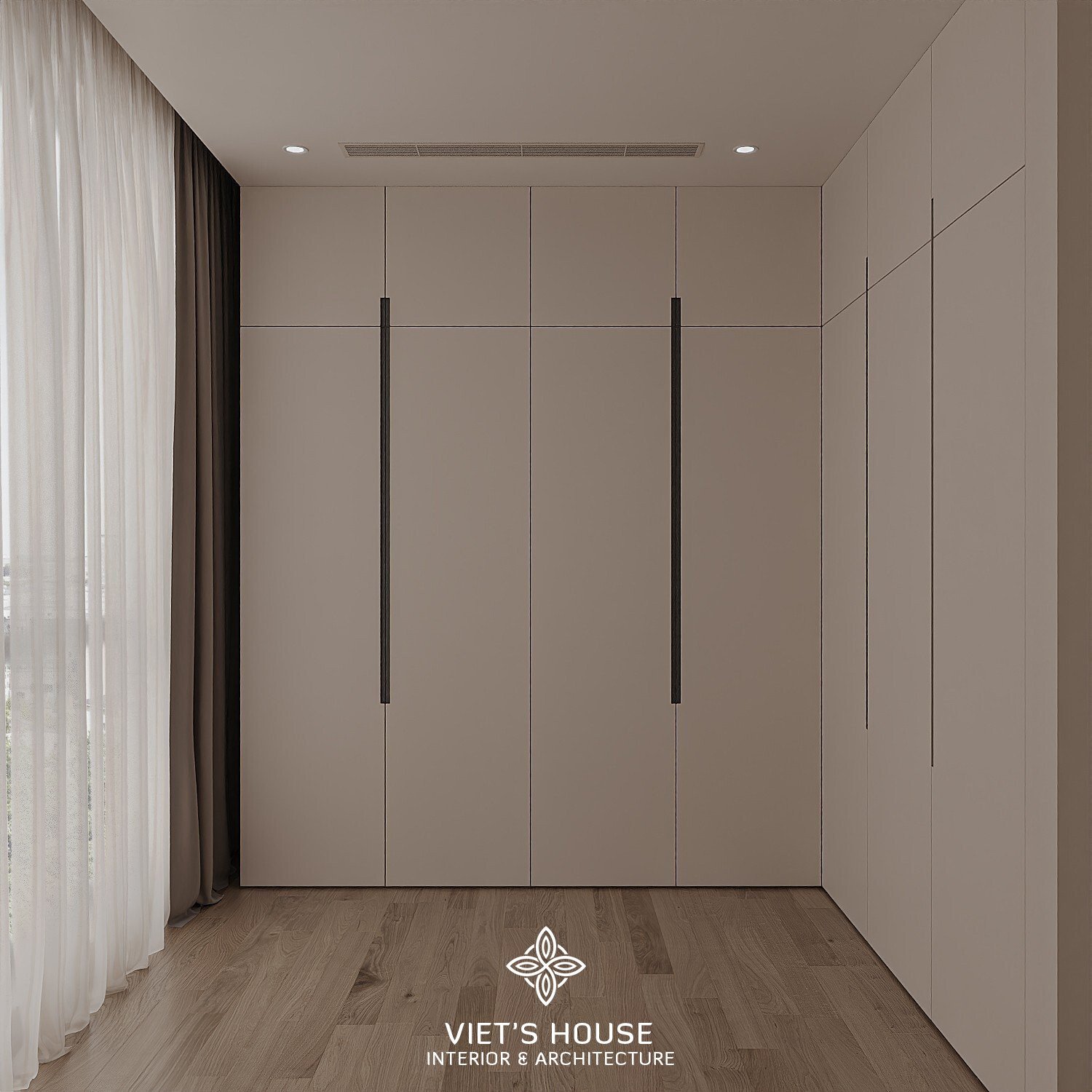 Hệ tủ lớn âm tường, sắp xếp khoa học để quản lý trang phục và phụ kiện gọn gàng. Không gian này thể hiện rõ lối sống ngăn nắp, chuẩn mực – đặc trưng của người làm trong lĩnh vực ngân hàng.