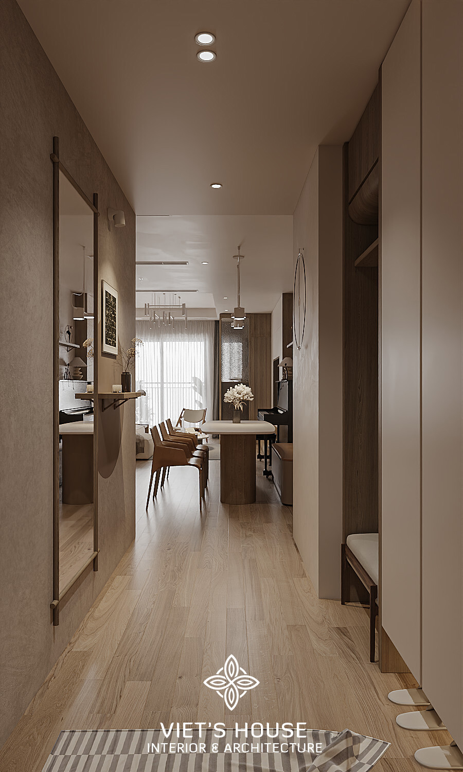 Lối vào căn hộ gọn gàng với gương lớn và ánh sáng chào đón.