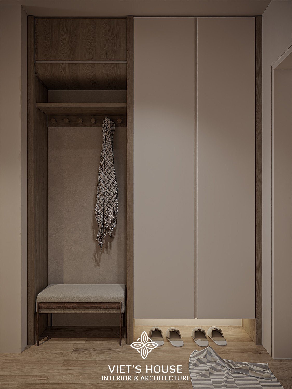 Khu vực để giày và treo đồ tiện lợi với ghế ngồi nhỏ, thiết kế tối giản mà ấm áp.