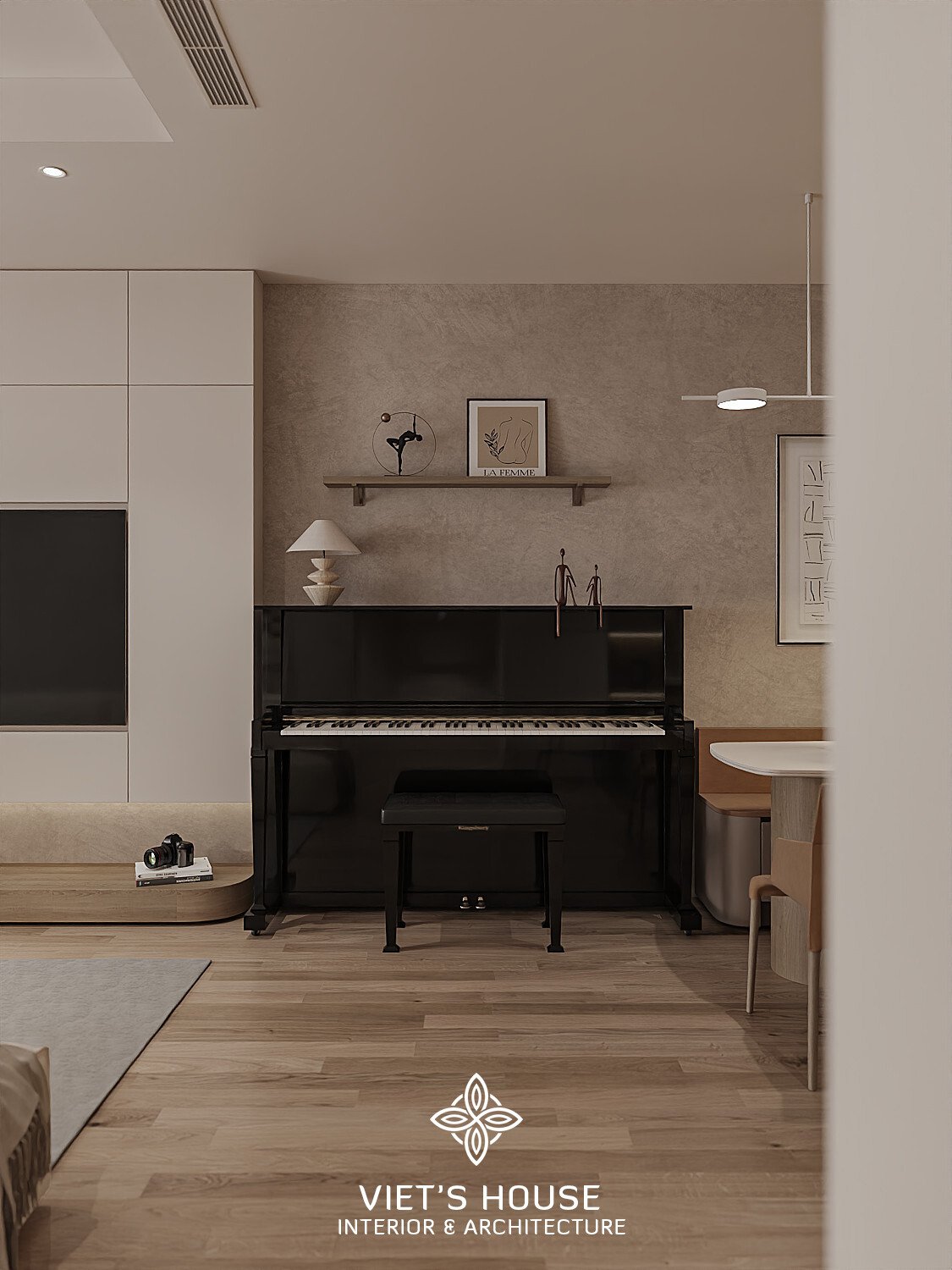 Góc piano đen tạo nét nghệ thuật và thư giãn cho không gian.