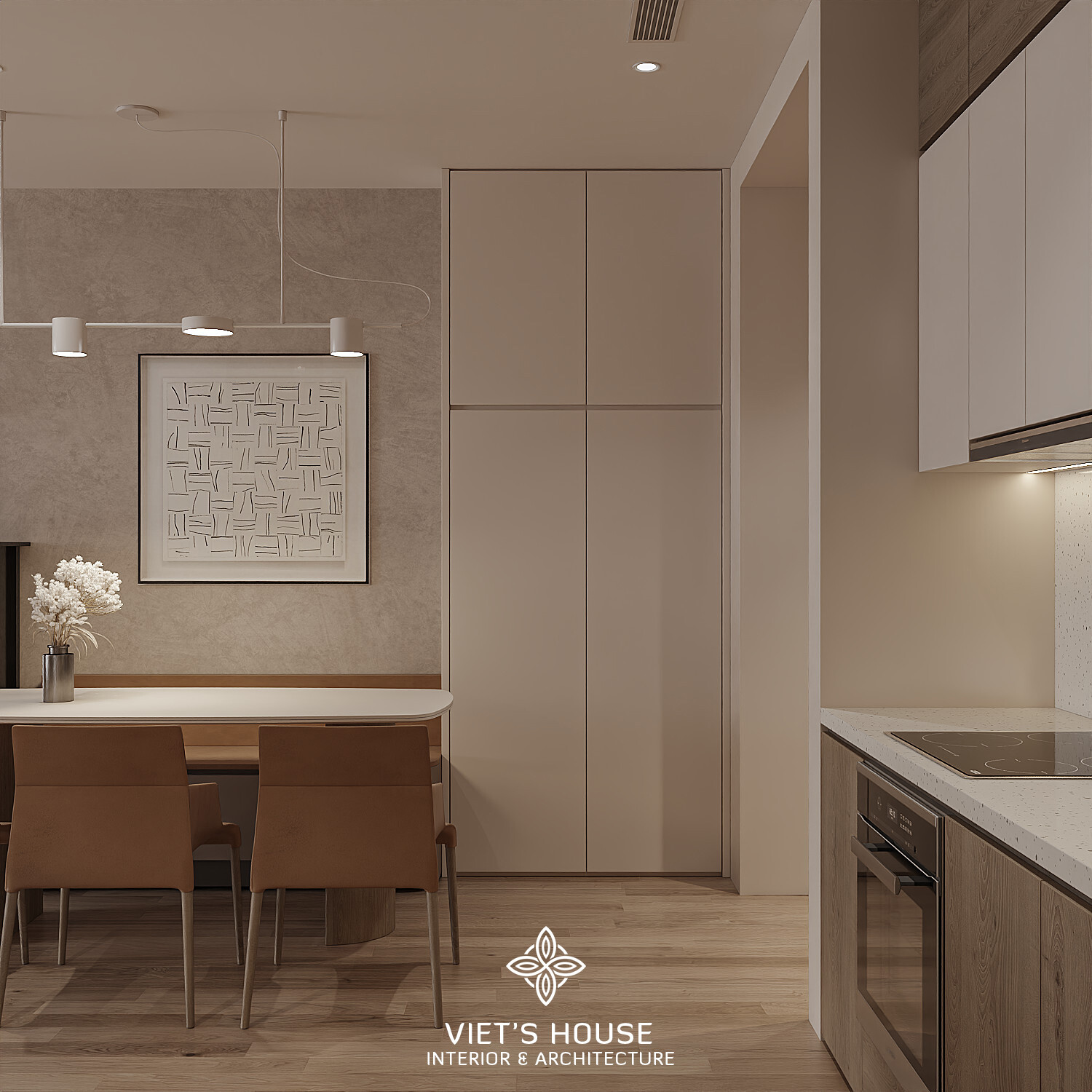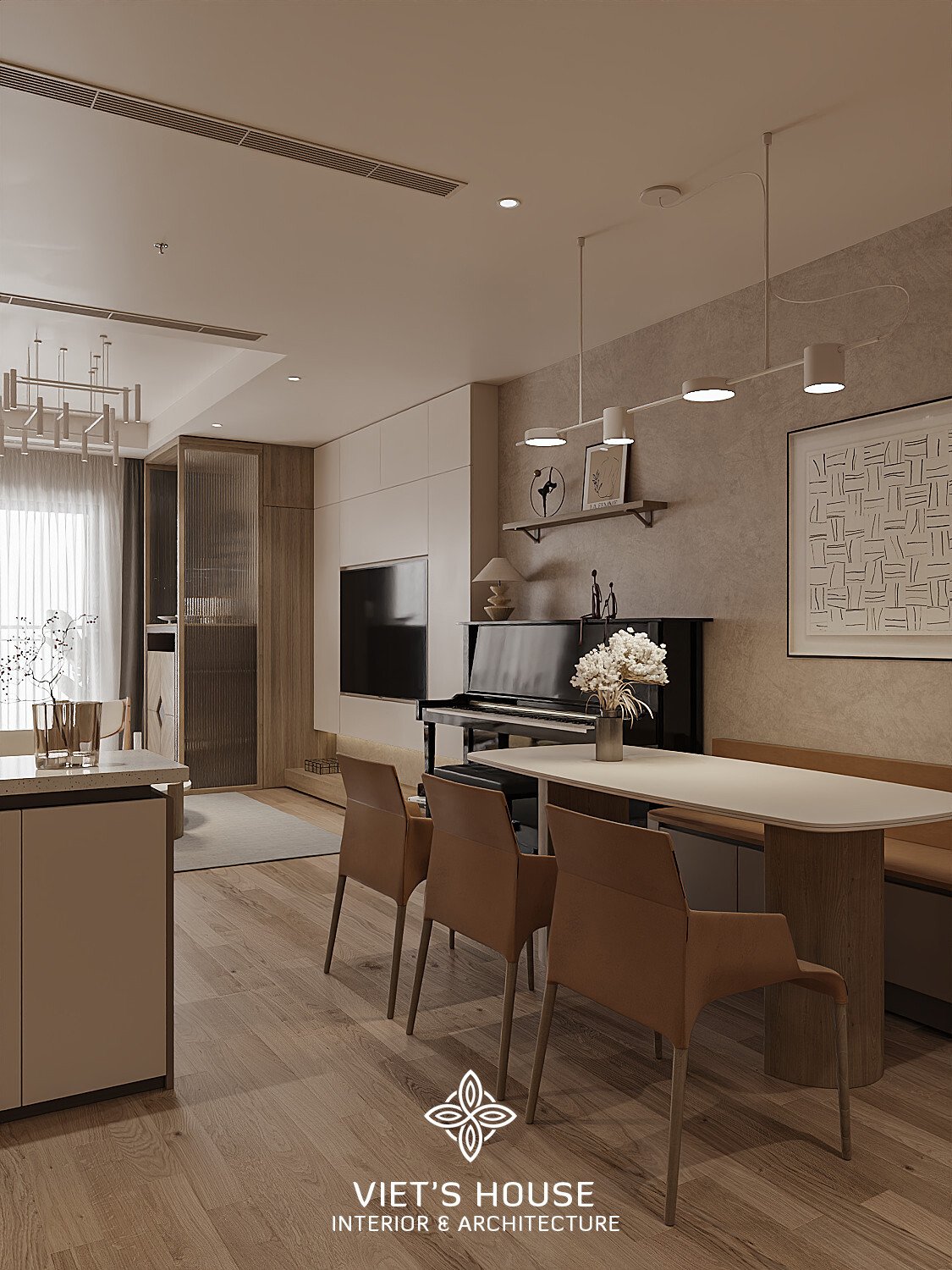 Một không gian liền mạch, nơi phòng khách, bếp và bàn ăn được kết nối tự nhiên. Sofa sáng màu, bàn trà đá, mảng tường ốp gỗ kết hợp ánh sáng chan hòa từ cửa kính lớn. Ngay bên cạnh là bàn ăn dài với ghế bọc nệm và hệ tủ bếp gỗ – đá sáng hiện đại. Tổng thể gọn gàng, trật tự, phản chiếu sự chỉn chu và kỷ luật, nhưng vẫn đem đến cảm giác thư giãn, ấm áp.