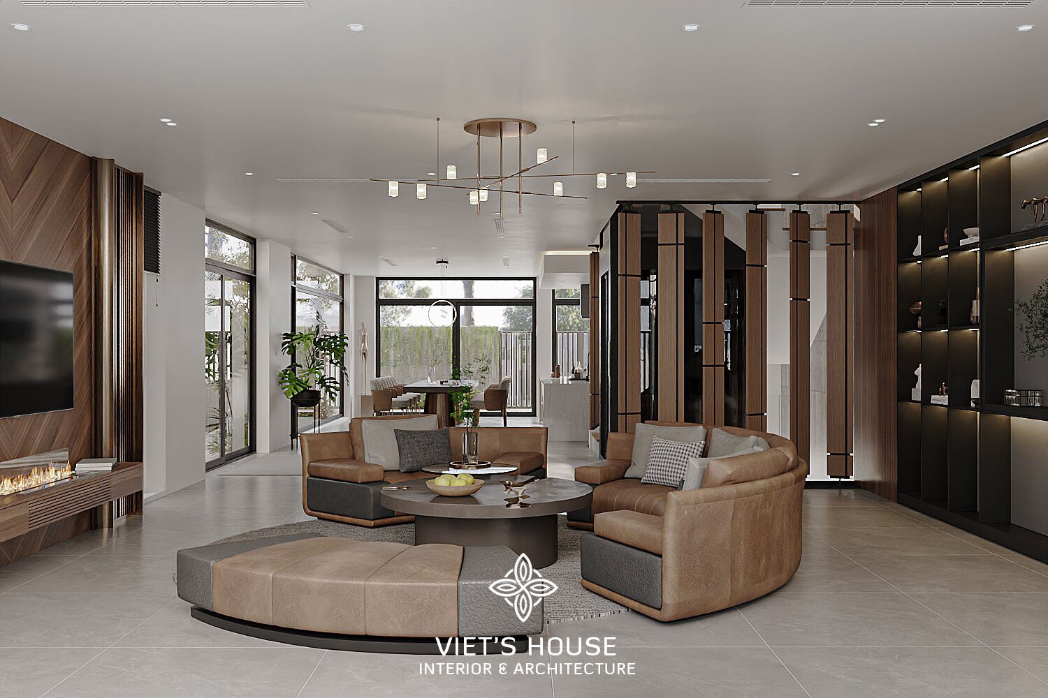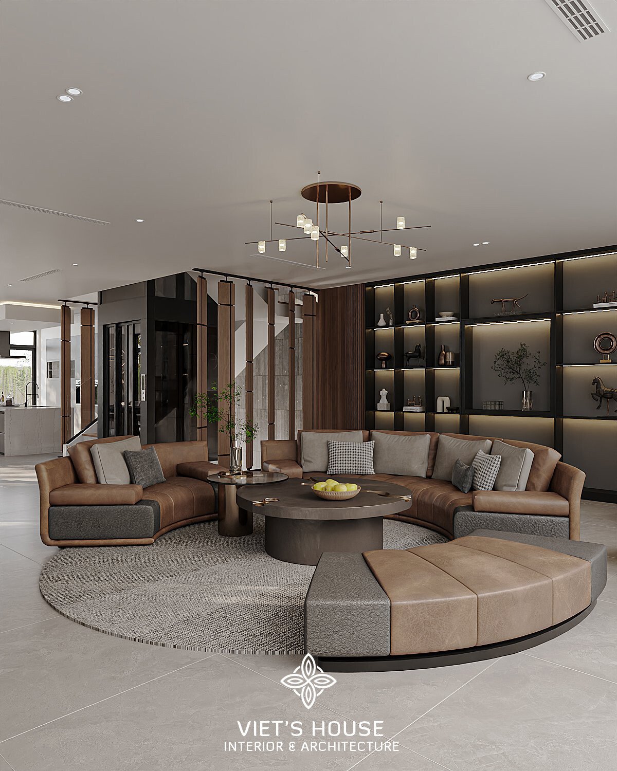 Phòng khách trung tâm với sofa lớn màu nâu – xám, bàn tròn gỗ – đá và tủ trưng bày âm tường với ánh sáng hắt ấm cúng.