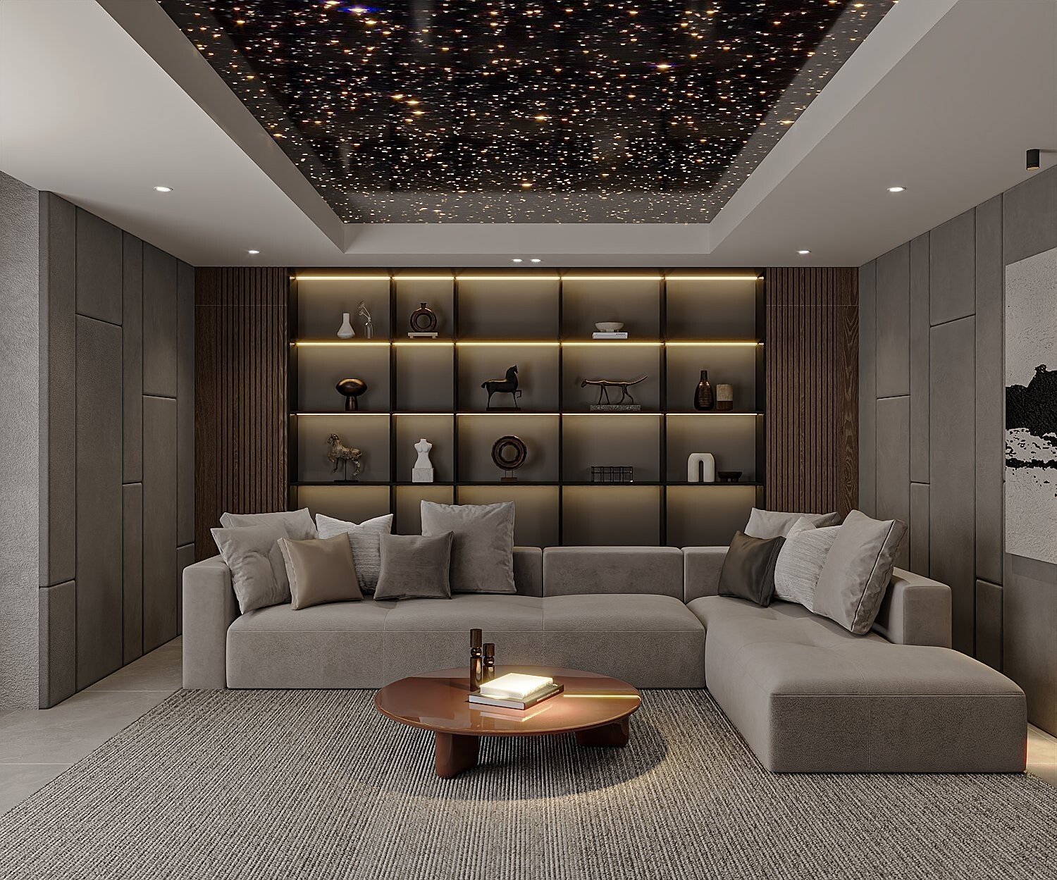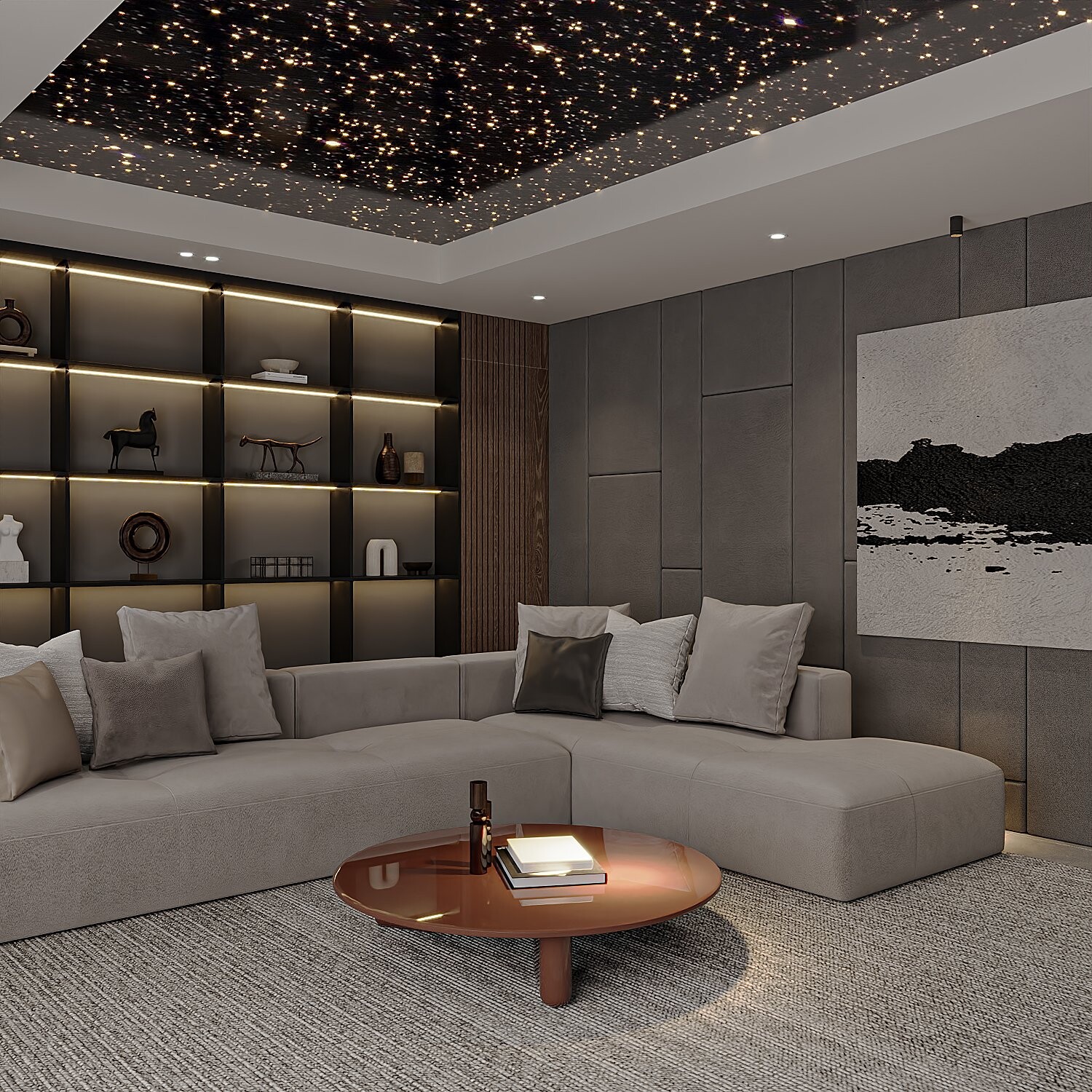 Toàn cảnh phòng giải trí, trần ánh sao kết hợp hệ sofa và bàn trà tròn thấp.
