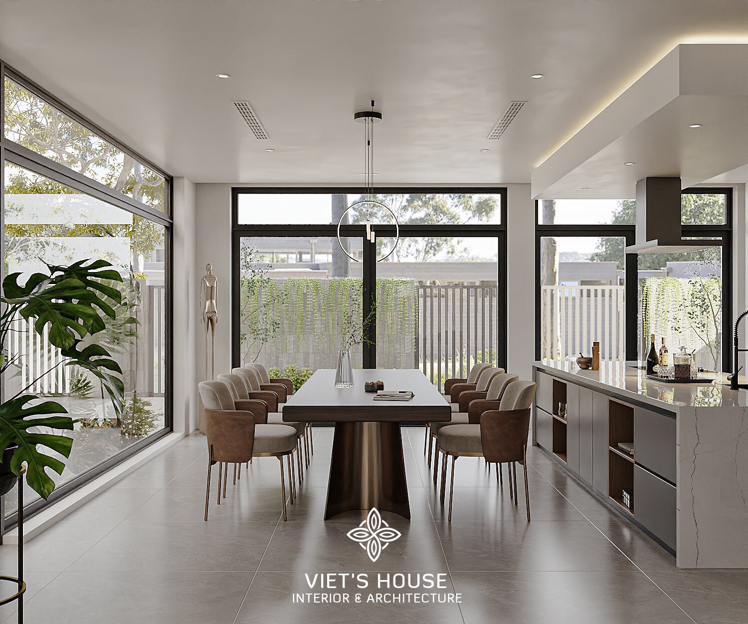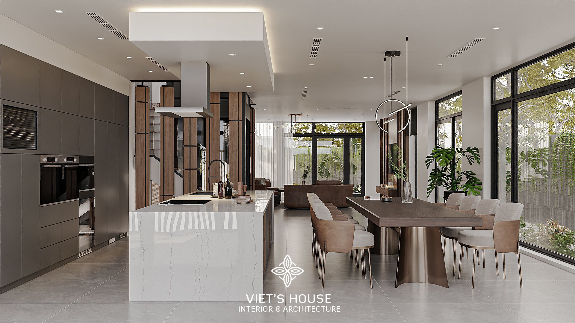 Không gian bếp – ăn nối liền, bàn ăn gỗ lớn kết hợp ghế bọc da tạo sự cân bằng giữa sang trọng và gần gũi.