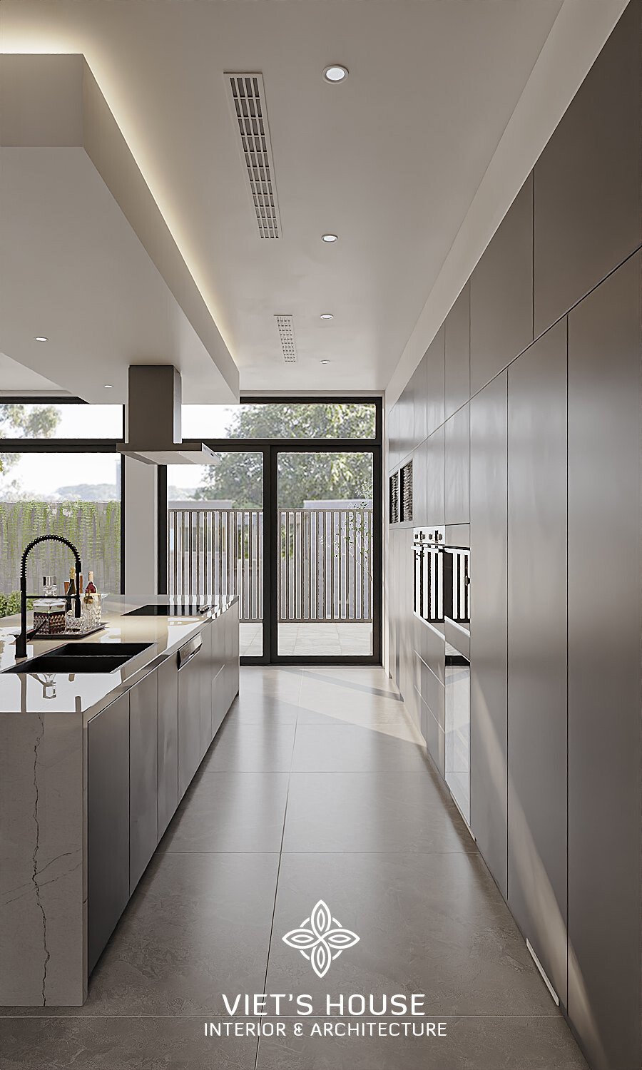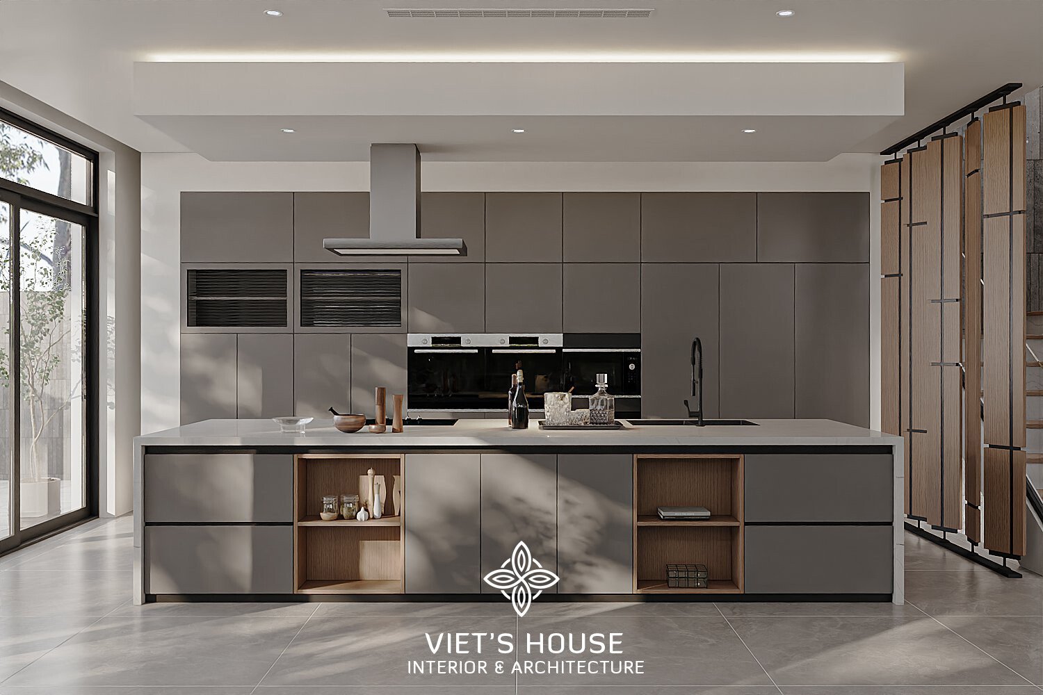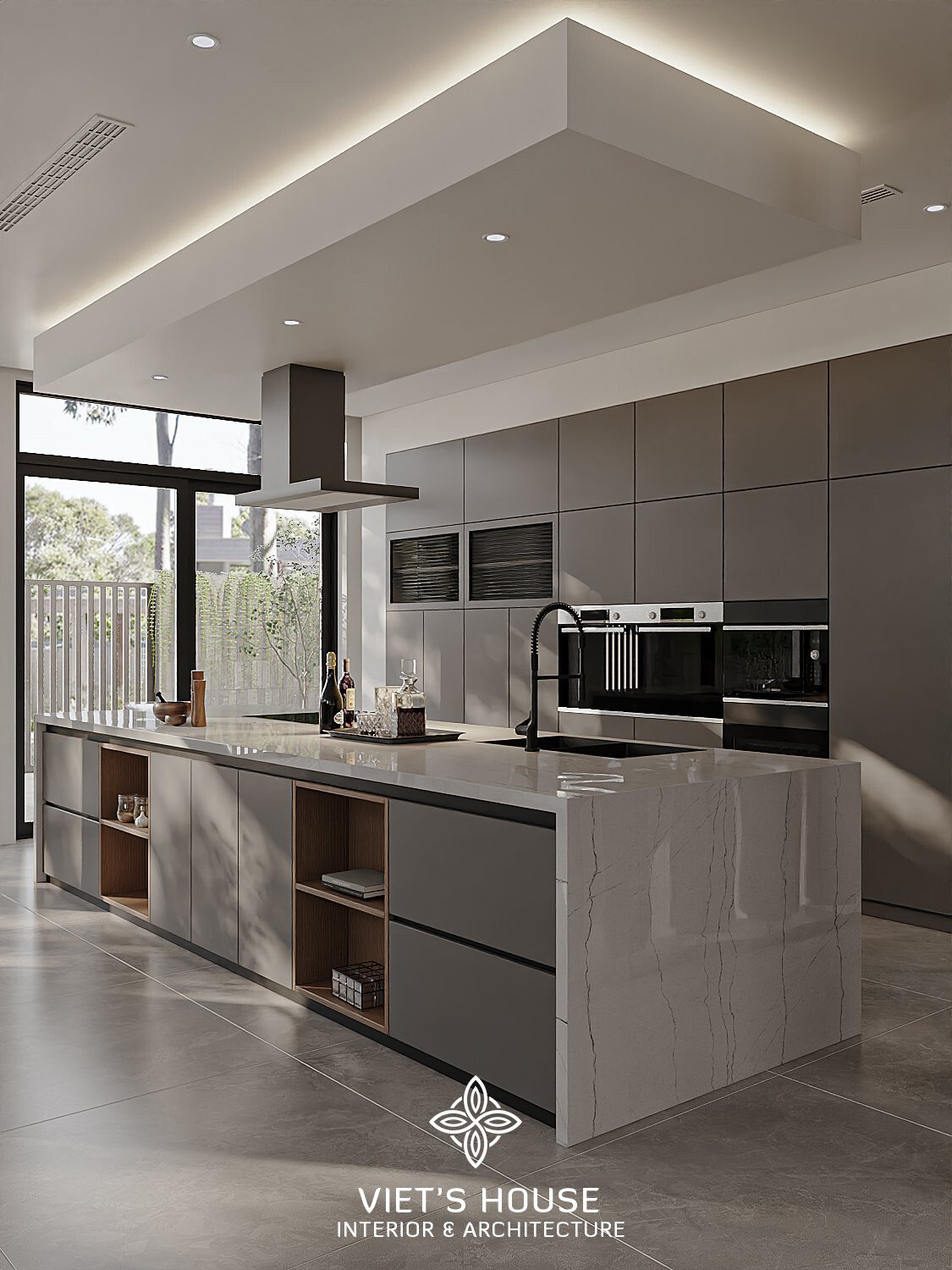 Bếp đảo lớn với mặt đá vân mây trắng, hệ tủ phẳng màu ghi và thiết bị bếp âm tường tối giản.