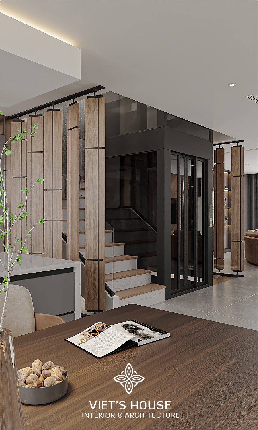 Thang bộ kết hợp thang máy kính đen, điểm nhấn là vách ngăn gỗ hiện đại.