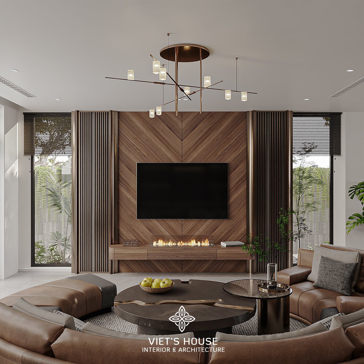 Vách gỗ ốp TV kết hợp lò sưởi giả hiện đại, vừa sang trọng vừa ấm áp.