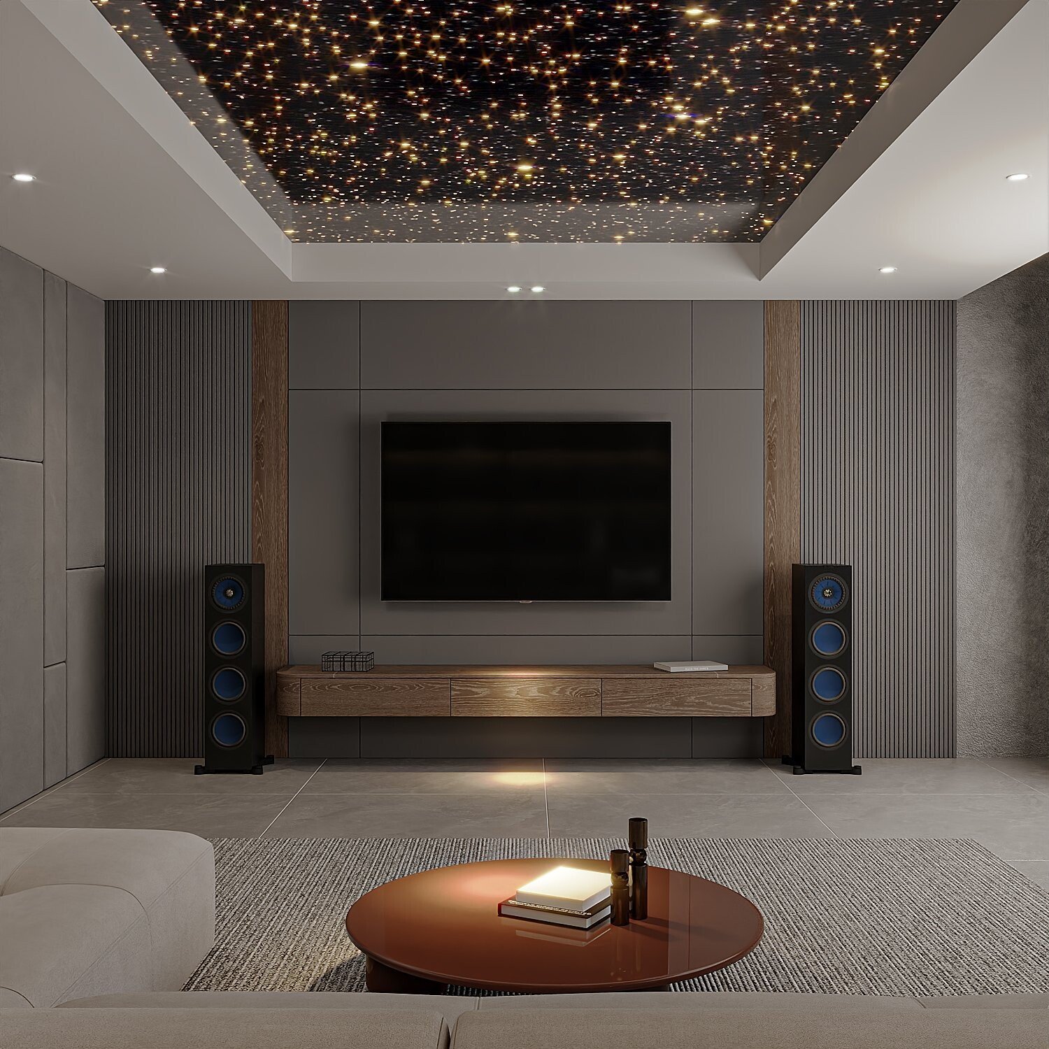 Phòng giải trí với TV lớn, loa stereo, trần giả bầu trời sao và sofa rộng.