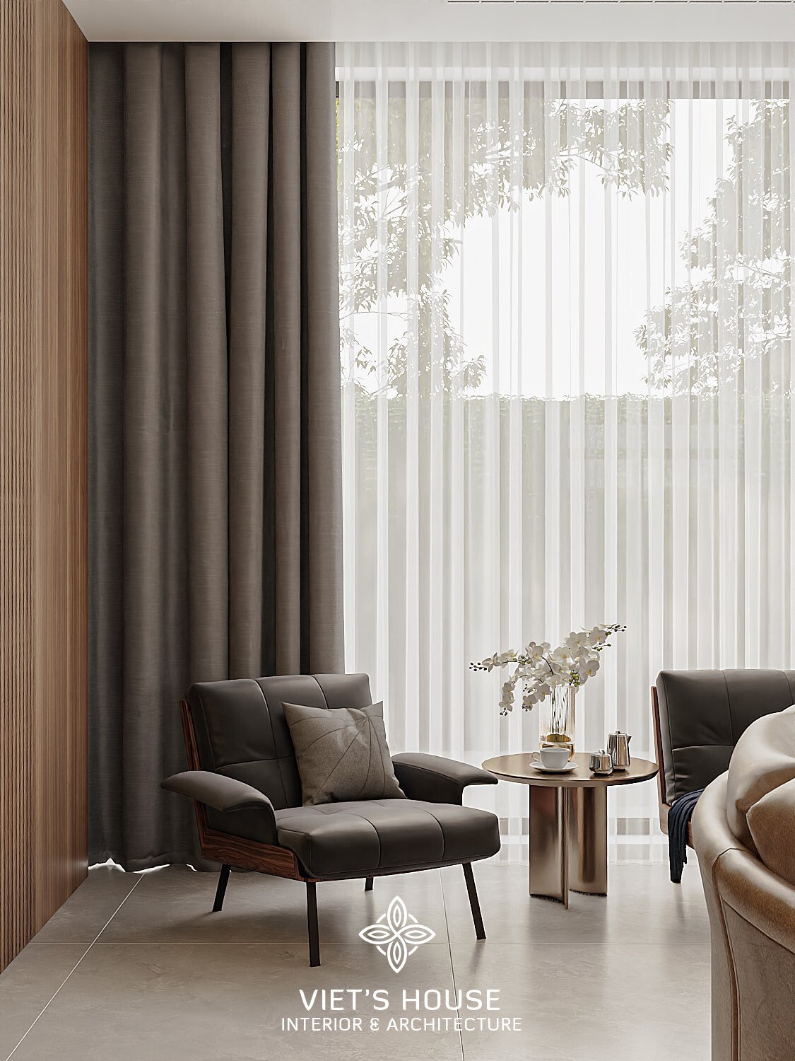 Ghế bành da màu trầm đặt cạnh cửa kính lớn, ánh sáng xuyên qua lớp rèm mỏng mang đến cảm giác thư thái và riêng tư.